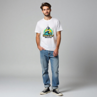 Celebrate the 70s vibe with this unisex organic cotton t-shirt featuring a vibrant disco ball over crashing waves and a sunburst. Soft, eco-friendly fabric for comfortable everyday wear. Perfect for surf lovers and disco fans alike—Shine & Surf.