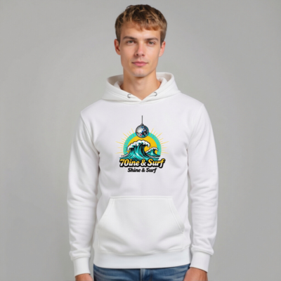 Show off retro vibes with this unisex premium pullover hoodie featuring a vibrant ‘Disco Wave’ graphic: a shimmering disco ball above turquoise ocean waves against a sunburst. Crafted for comfort and style, it’s perfect for surf lovers and disco enthusiasts alike. The bold ’70ine & Surf’ branding captures the 70s nostalgia and beachside energy. Soft, durable fabric ensures all-day wear. Ideal for casual outings or themed events.