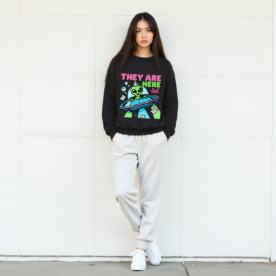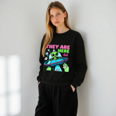 Fun unisex crew neck sweatshirt featuring a cute green alien in a blue UFO with party hat and floating papers. Bold text ‘THEY ARE HERE lol’ in pink/green. Soft, comfortable fit for casual wear. Perfect for sci-fi fans and humor lovers. Designed for everyday comfort with quality print.