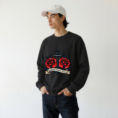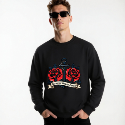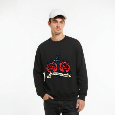 Bold vintage-style anchor with two red roses and a ribbon banner reading ‘Anchored Hearts Forever’—a timeless nautical-romantic design on a comfortable unisex crew neck sweatshirt. Perfect for lovers of classic tattoo art, maritime themes, or meaningful everyday wear. Soft cotton blend, relaxed fit, durable print. Ideal gift for couples or sea enthusiasts.