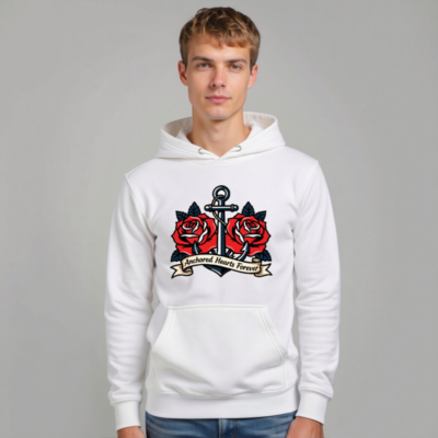 A premium unisex pullover hoodie featuring a bold vintage tattoo-style design: a navy anchor entwined with two vibrant red roses and the phrase ‘Anchored Hearts Forever’ on a ribbon. Crafted for comfort and style, this versatile hoodie combines nautical symbolism with romantic imagery—ideal for lovers of classic tattoo art and coastal aesthetics.