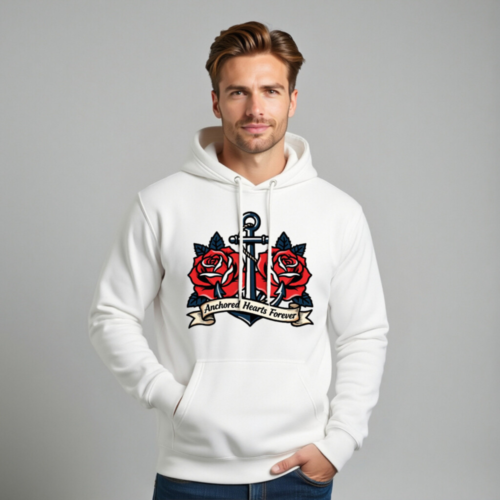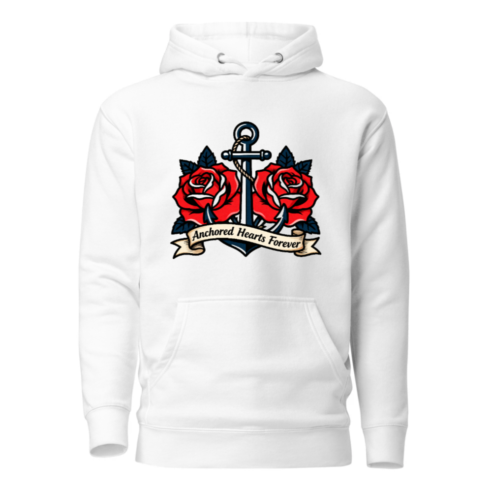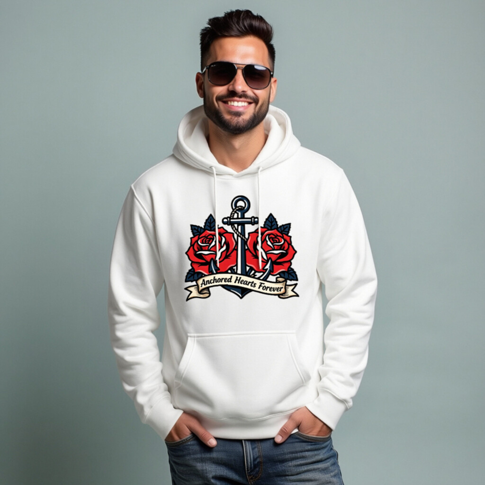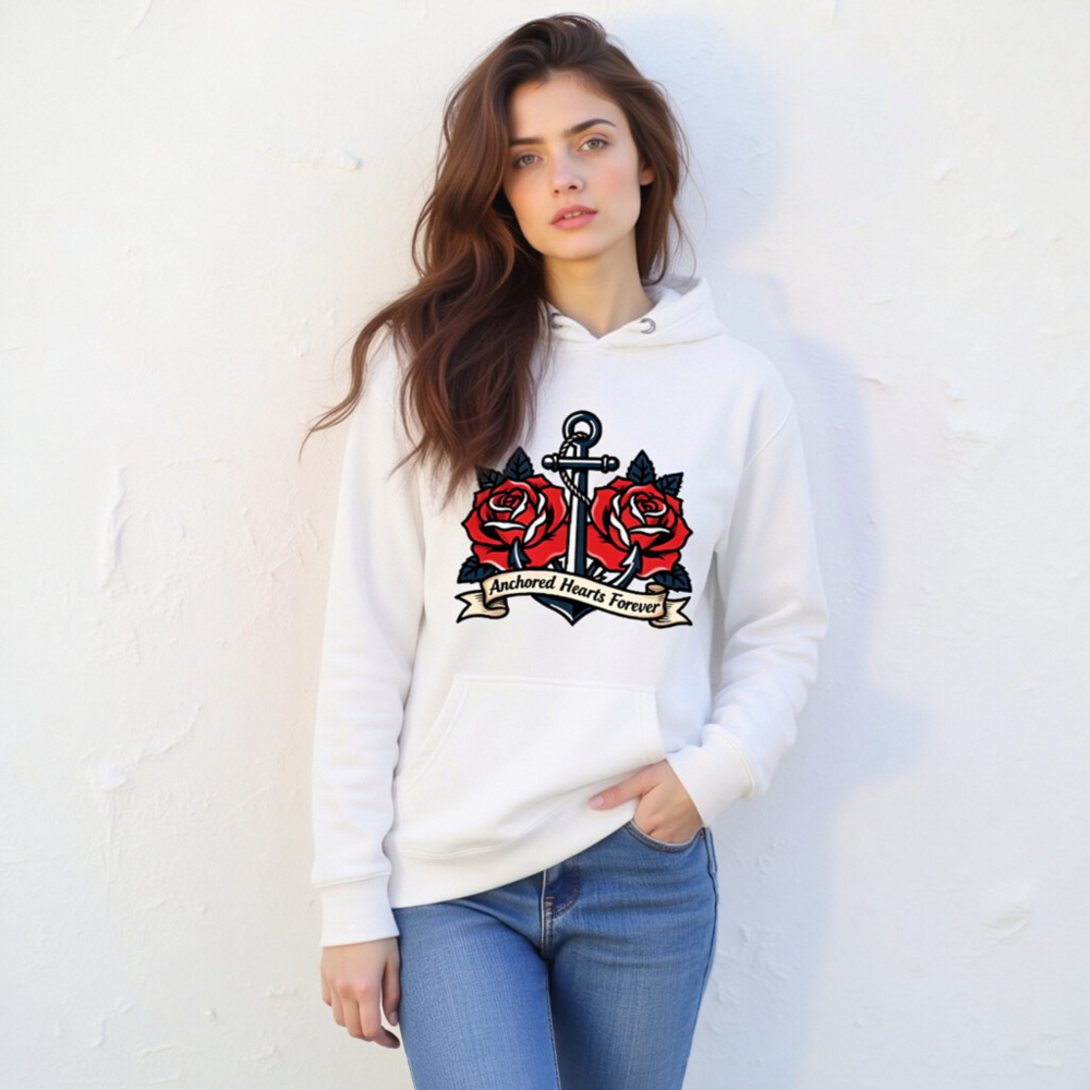 A premium unisex pullover hoodie featuring a bold vintage tattoo-style design: a navy anchor entwined with two vibrant red roses and the phrase ‘Anchored Hearts Forever’ on a ribbon. Crafted for comfort and style, this versatile hoodie combines nautical symbolism with romantic imagery—ideal for lovers of classic tattoo art and coastal aesthetics.