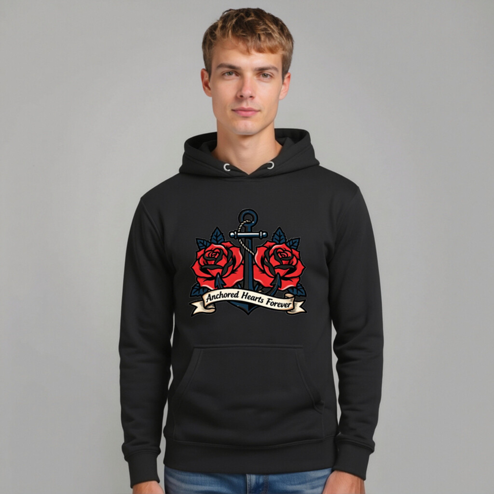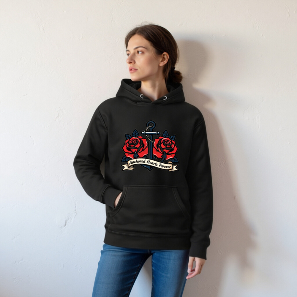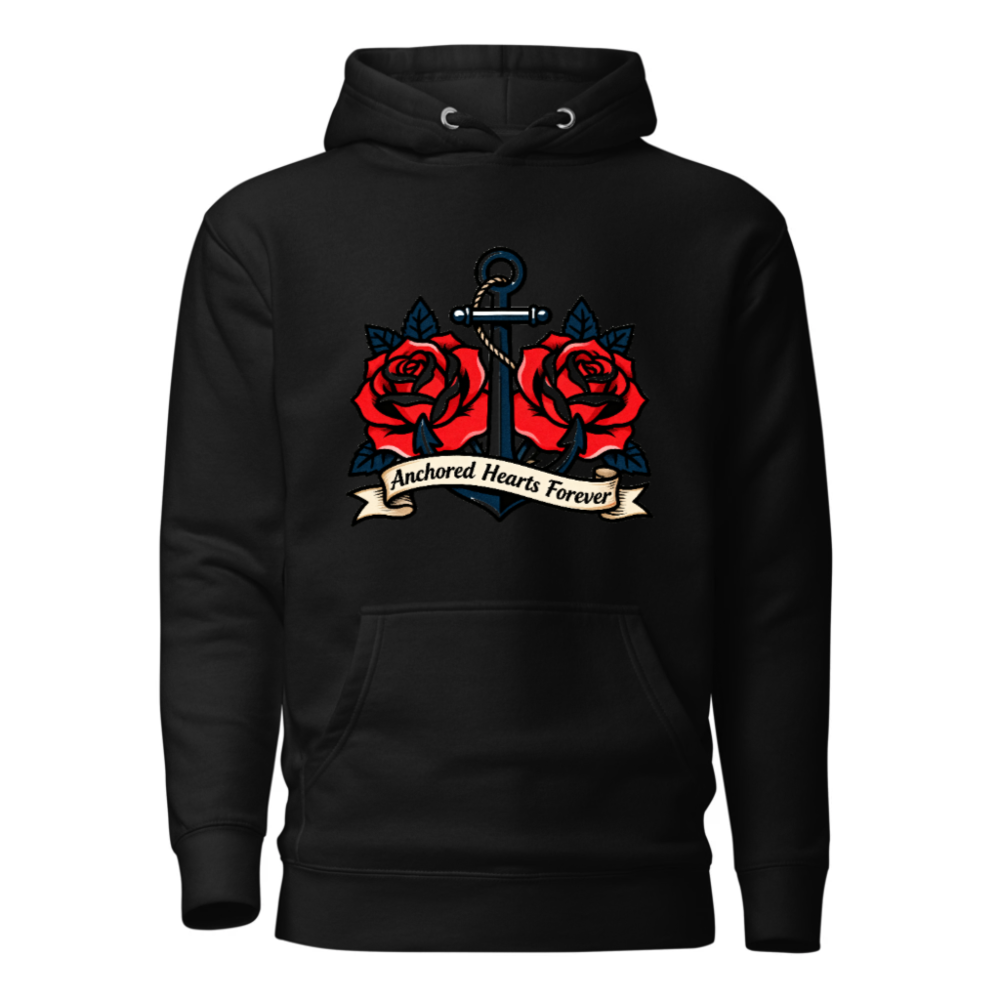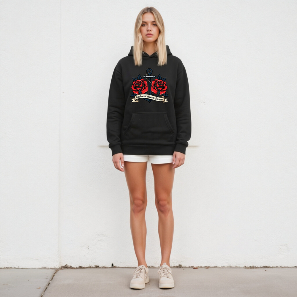 Anchored Hearts Forever Hoodie – Unisex Premium Pullover with Rose Anchor Tattoo Design