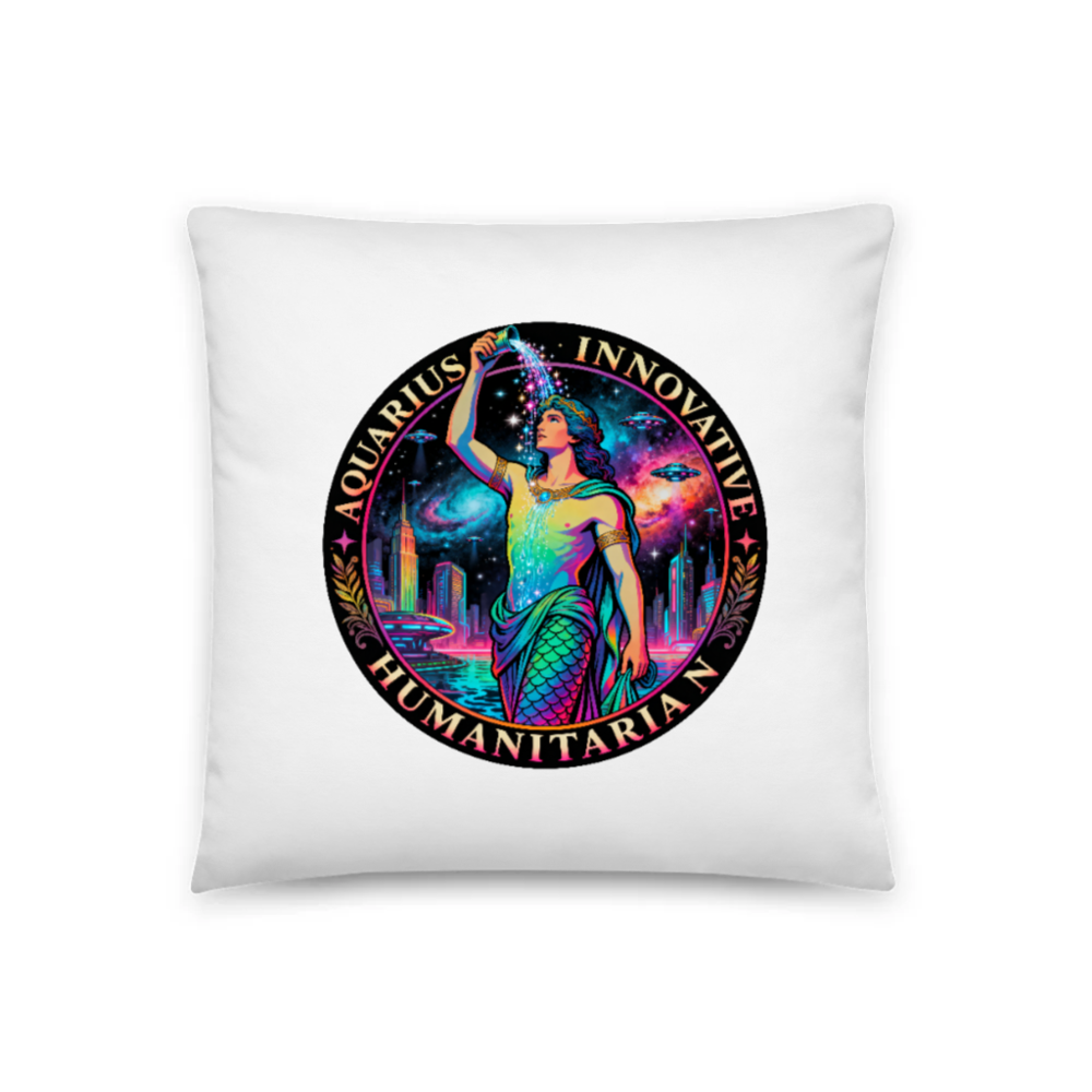 Celebrate the Water Bearer with this vibrant 18″x18″ basic pillow featuring a cosmic Aquarius design—rainbow-hued figure pouring water against a futuristic cityscape and starry galaxy. Embodying ‘Innovative Humanitarian’ traits, this artful pillow blends zodiac symbolism with modern aesthetics for home or gift use. Ideal for astrology lovers seeking meaningful decor.