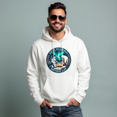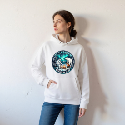 Chase the Northern Lights with this eco-friendly unisex hoodie featuring a stunning Arctic wilderness design: Yeti, polar bear, red fox, and campfire under aurora borealis. Sustainable, soft cotton blend. Perfect for nature lovers, adventurers, and Northern Lights enthusiasts. Mindful footprints, wild spirit — wear the magic of the Arctic.