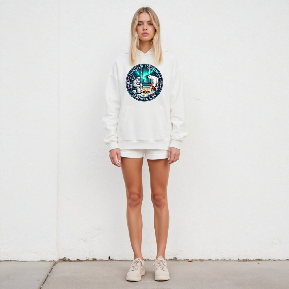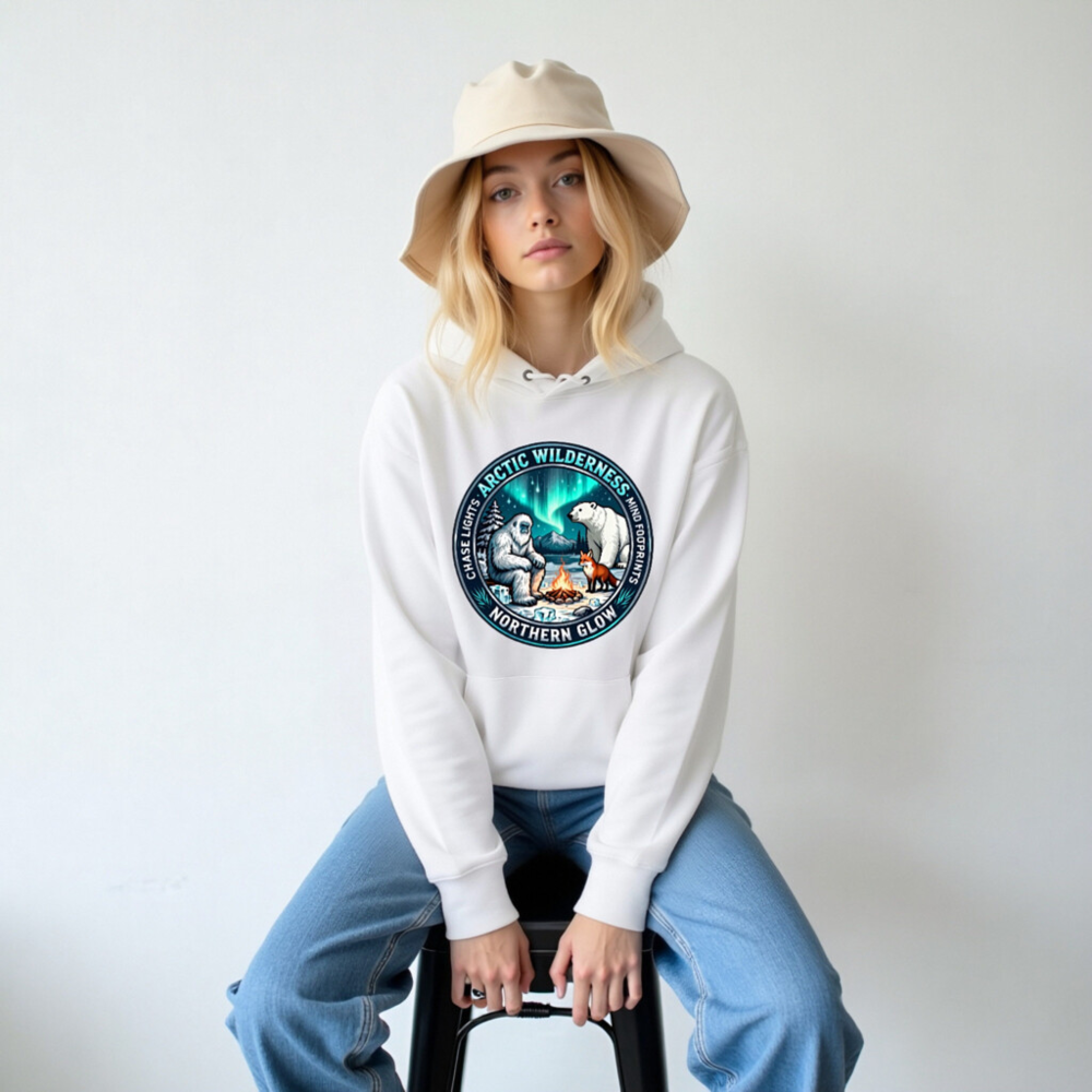 Arctic Wilderness Hoodie | Northern Glow, Yeti & Polar Bear Campfire Design – Eco Unisex Sweatshirt