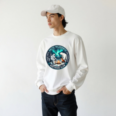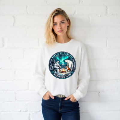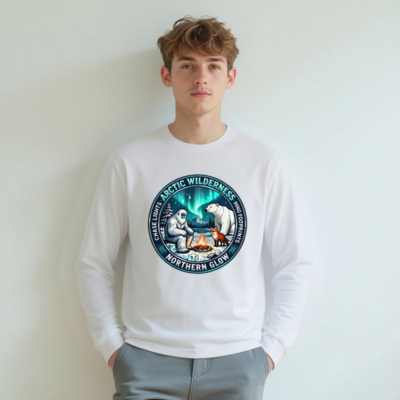 Chase lights, mind footprints: This unisex long sleeve tee features a vibrant Arctic wilderness scene with polar bear, yeti, and fox gathered around a campfire under the aurora borealis. Perfect for nature lovers seeking cozy, adventurous style. Soft cotton blend, classic fit, ideal for cold-weather adventures or everyday wear.