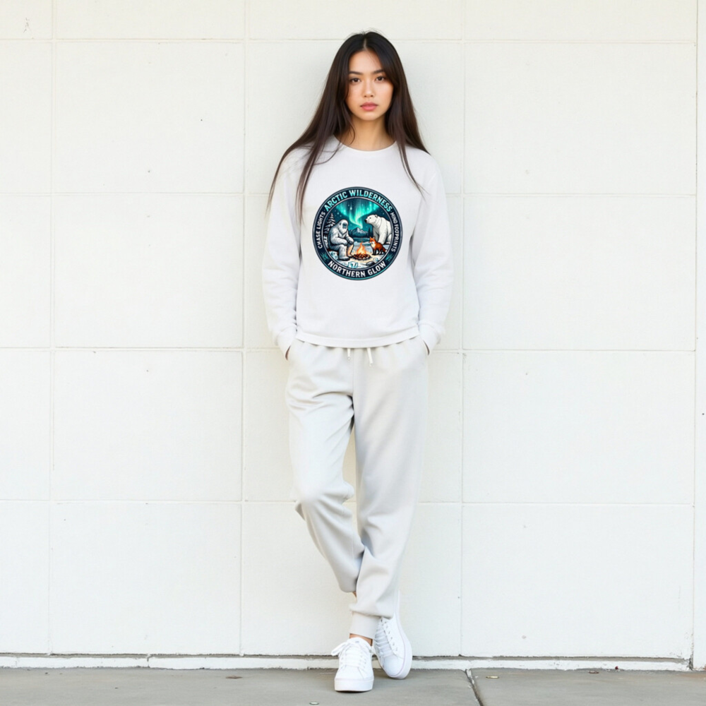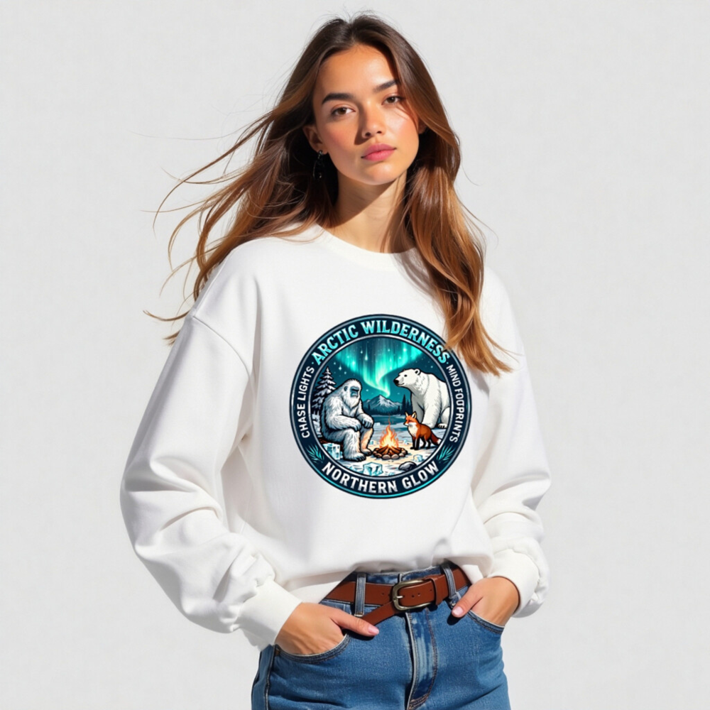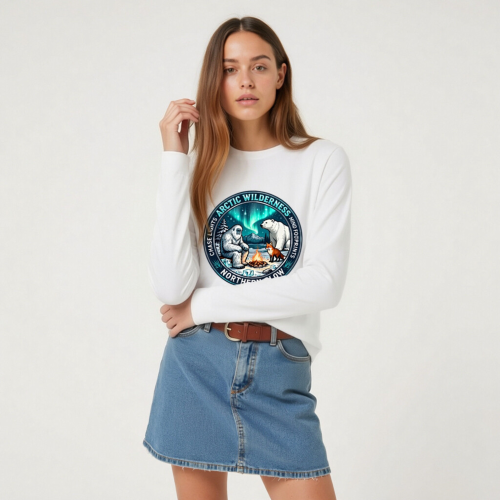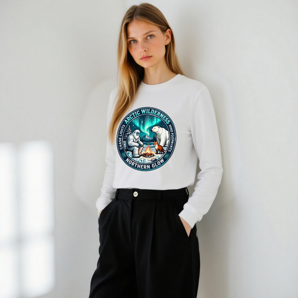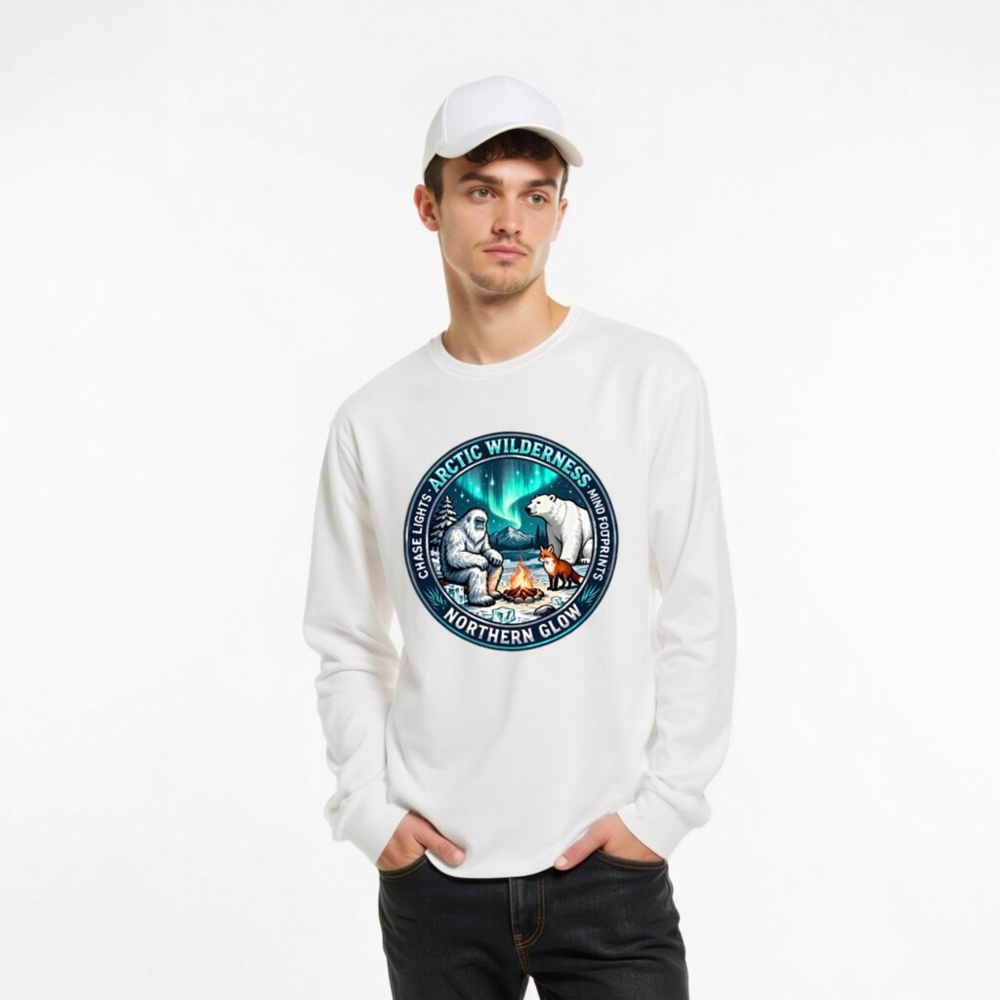 Chase lights, mind footprints: This unisex long sleeve tee features a vibrant Arctic wilderness scene with polar bear, yeti, and fox gathered around a campfire under the aurora borealis. Perfect for nature lovers seeking cozy, adventurous style. Soft cotton blend, classic fit, ideal for cold-weather adventures or everyday wear.