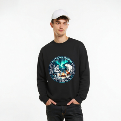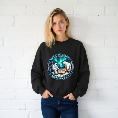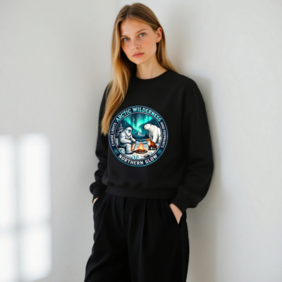 Chase lights, mind footprints—this unisex crew neck sweatshirt features a vibrant Arctic wilderness design with Yeti, polar bear, fox, campfire, and aurora borealis. Premium comfort fit, soft cotton blend, perfect for cold-weather adventures. Ideal gift for nature lovers and outdoor enthusiasts.