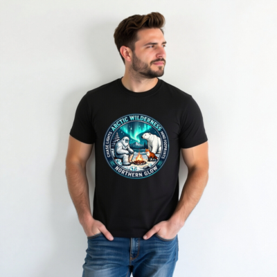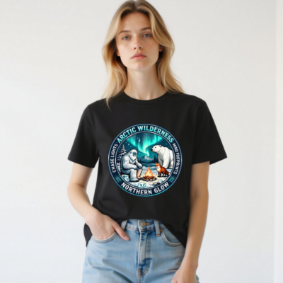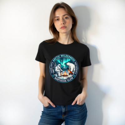 Chase lights, mind footprints—this unisex organic cotton t-shirt features a stunning Arctic wilderness design with Yeti, polar bear, fox, campfire, and aurora borealis. Crafted for comfort and sustainability, it’s ideal for nature lovers seeking eco-conscious style. Perfect for adventurers who embrace the wild.