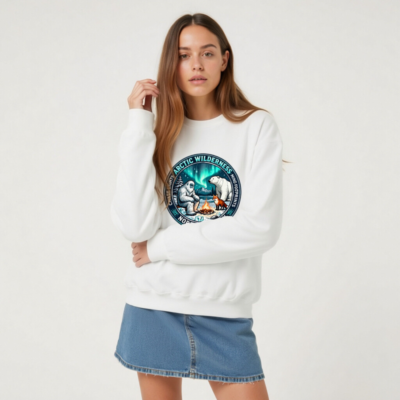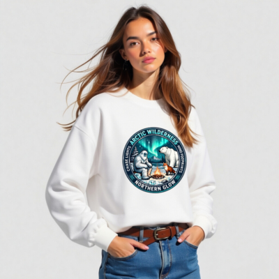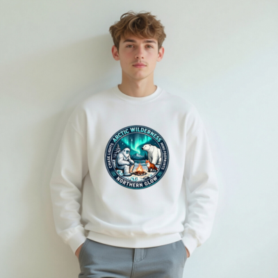 Embrace the wild with this unisex crew neck sweatshirt featuring a stunning Arctic wilderness design: Yeti, polar bear, and fox gathered around a campfire under the aurora borealis. Premium soft fabric, comfortable fit for all genders. Celebrate nature’s magic—’Chase Lights, Mind Footprints, Northern Glow’—on every wear. Ideal for outdoor lovers, travelers, and northern light enthusiasts.