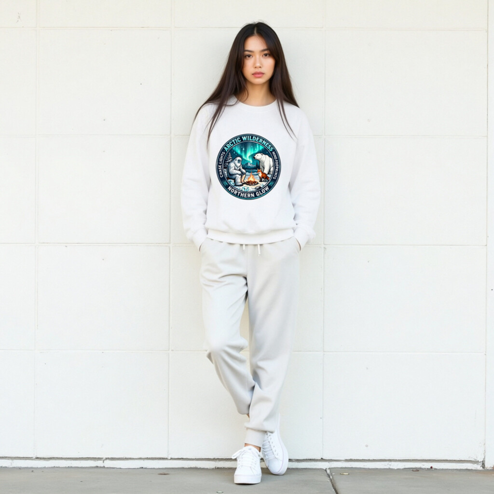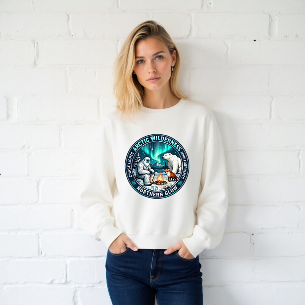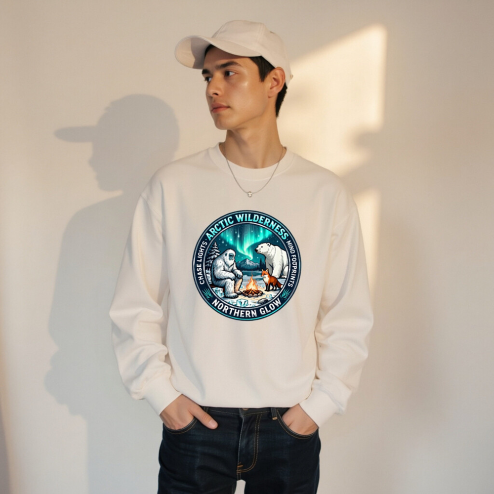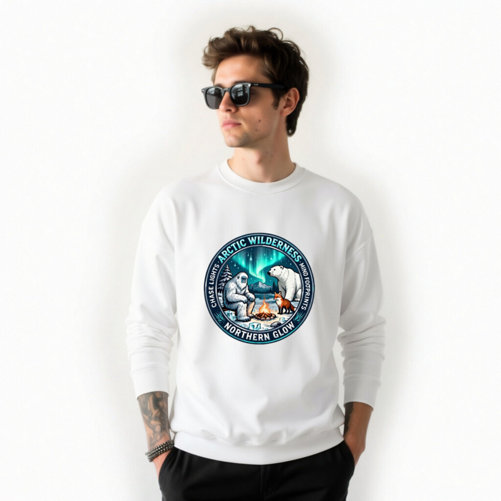 Embrace the wild with this unisex crew neck sweatshirt featuring a stunning Arctic wilderness design: Yeti, polar bear, and fox gathered around a campfire under the aurora borealis. Premium soft fabric, comfortable fit for all genders. Celebrate nature’s magic—’Chase Lights, Mind Footprints, Northern Glow’—on every wear. Ideal for outdoor lovers, travelers, and northern light enthusiasts.