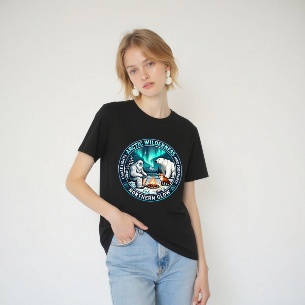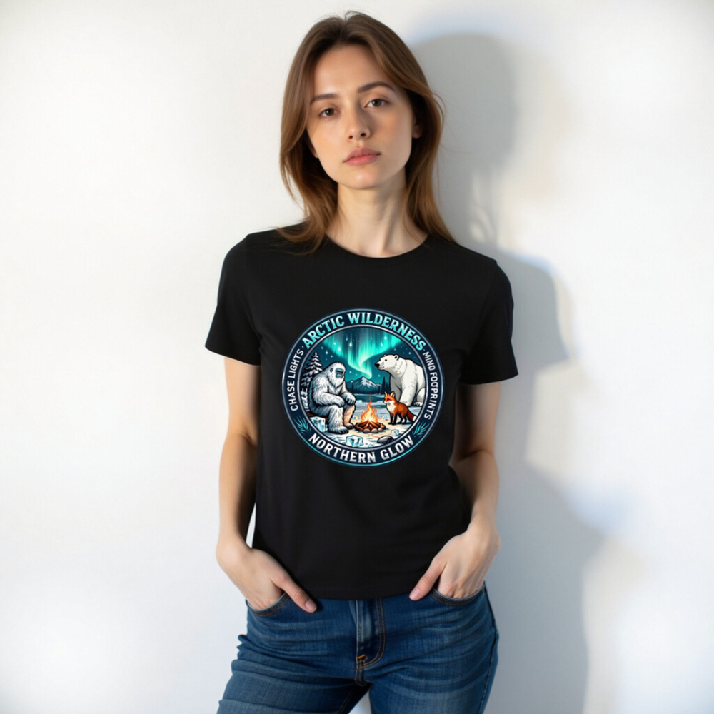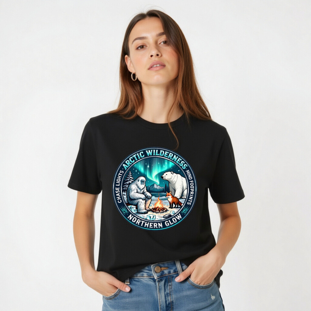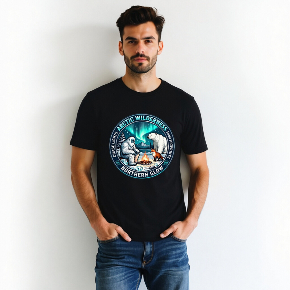 Experience the magic of the Arctic with this unisex staple t-shirt featuring a captivating design: Yeti, polar bear, and fox gathered around a campfire beneath vibrant aurora borealis. ‘Arctic Wilderness’ and ‘Northern Glow’ highlight the theme, while ‘Chase Lights’ and ‘Mind Footprints’ evoke adventure and mindfulness. Perfect for nature lovers seeking cozy, meaningful style.