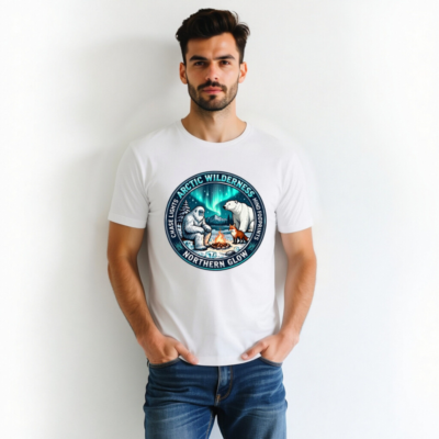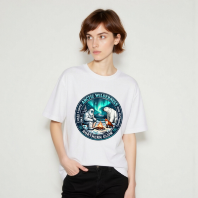 Celebrate the Arctic wilderness with this unisex staple t-shirt featuring a stunning circular design: a polar bear, yeti, and fox gathered around a campfire beneath vibrant aurora borealis. The ‘Arctic Wilderness’ and ‘Northern Glow’ theme evokes adventure, nature, and the magic of the northern lights. Perfect for outdoor lovers seeking cozy, meaningful style. Soft cotton blend, versatile fit—ideal for casual wear or travel souvenirs.