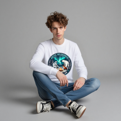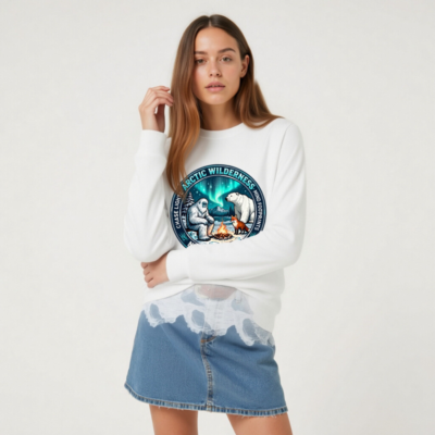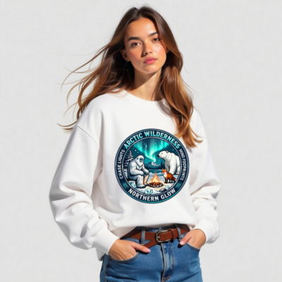 Unisex organic cotton sweatshirt featuring a vibrant Arctic wilderness design: Yeti, polar bear, and fox gathered around a campfire beneath the aurora borealis. ‘Arctic Wilderness’ and ‘Northern Glow’ text with ‘Chase Lights • Mind Footprints’ for eco-conscious adventure lovers. Soft, sustainable, and stylish—perfect for cold-weather wanderers.