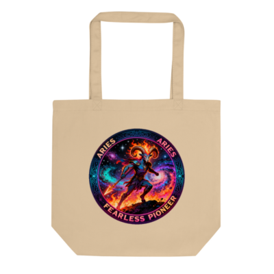 Eco Oyster Tote Bag featuring a vibrant Aries zodiac design—ram warrior with fiery horns, cosmic nebula background, and ‘Aries’ / ‘Fearless Pioneer’ text. Made from sustainable canvas for everyday use. Light, durable, and eco-conscious—perfect for astrology lovers seeking bold, ethical style.
