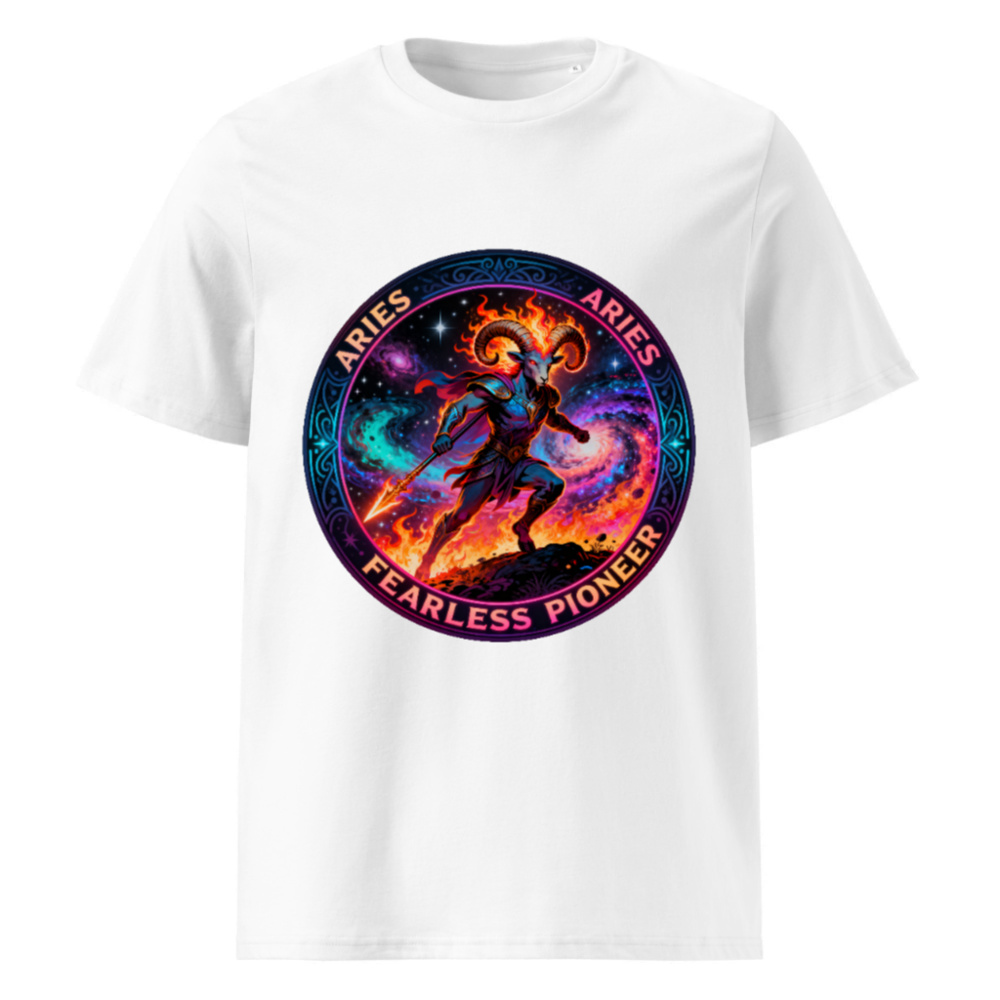 Celebrate Aries with this bold unisex organic cotton t-shirt featuring a vibrant cosmic ram warrior design—’Fearless Pioneer’ encircling the fierce, flame-horned zodiac symbol. Crafted for comfort and style, it’s made from certified organic cotton (no additional certifications claimed beyond material origin). Perfect for astrology lovers seeking empowered, eye-catching everyday wear.