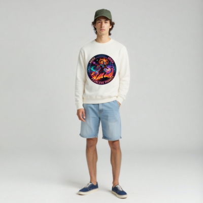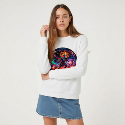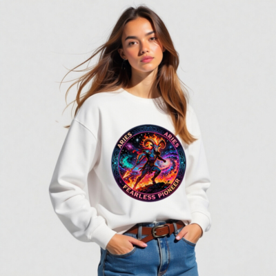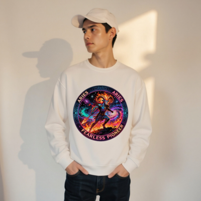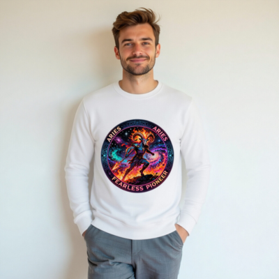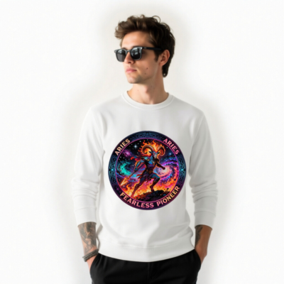 Wear the spirit of Aries: a bold, unisex organic sweatshirt featuring a fiery cosmic ram warrior—symbolizing courage, innovation, and fearless pioneering. Handcrafted from certified organic cotton for comfort and sustainability. Perfect for astrology lovers and zodiac enthusiasts seeking meaningful, high-quality apparel. Designed to inspire and stand out.
