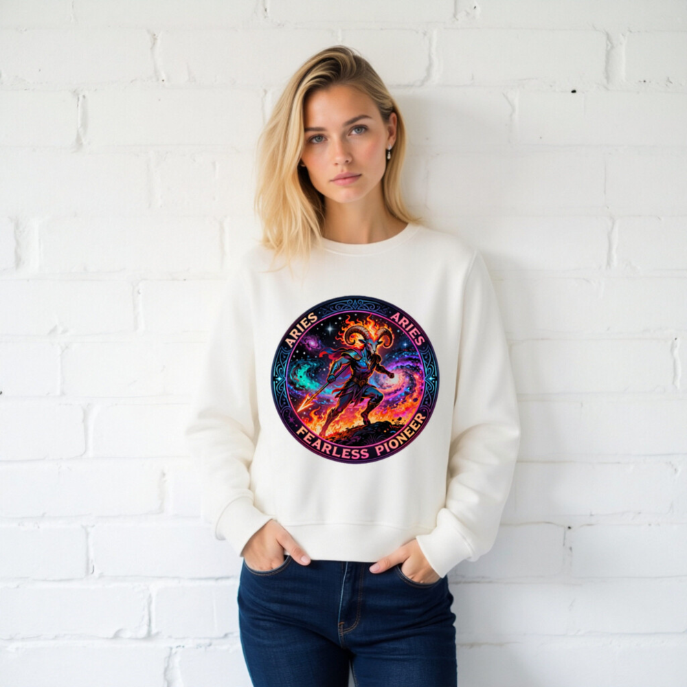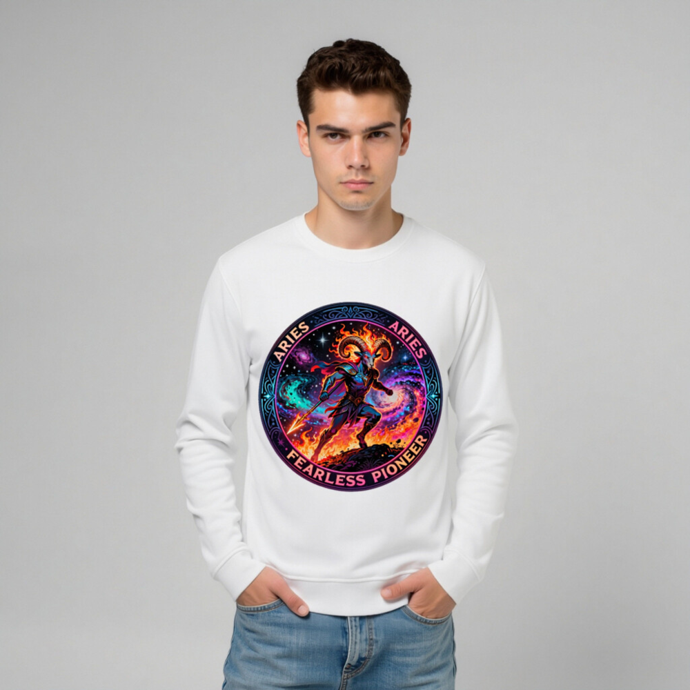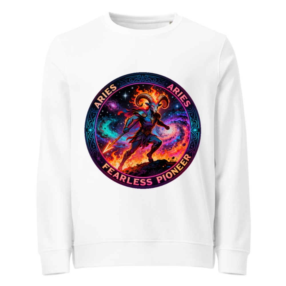 Aries Fearless Pioneer Unisex Organic Sweatshirt – Cosmic Ram Warrior Design