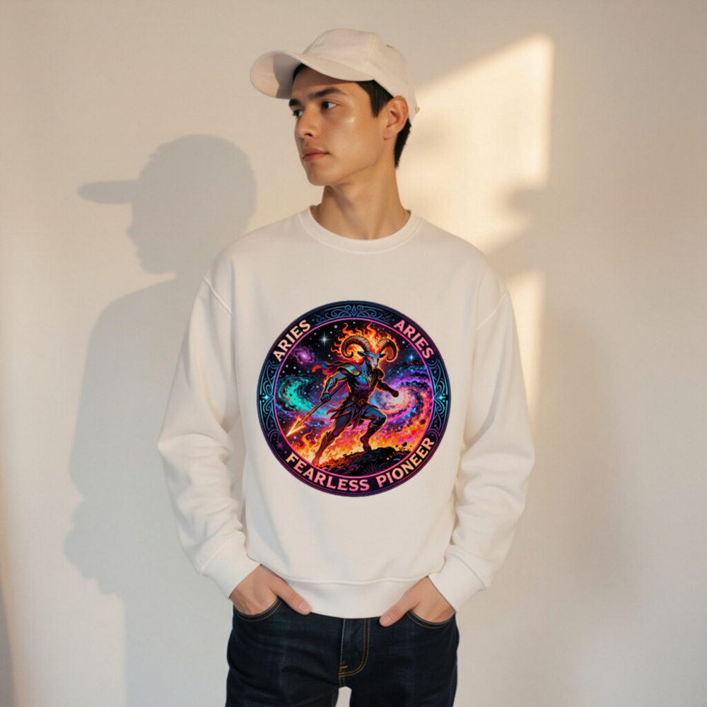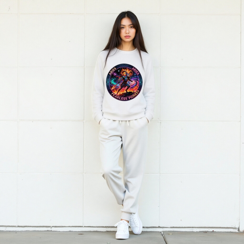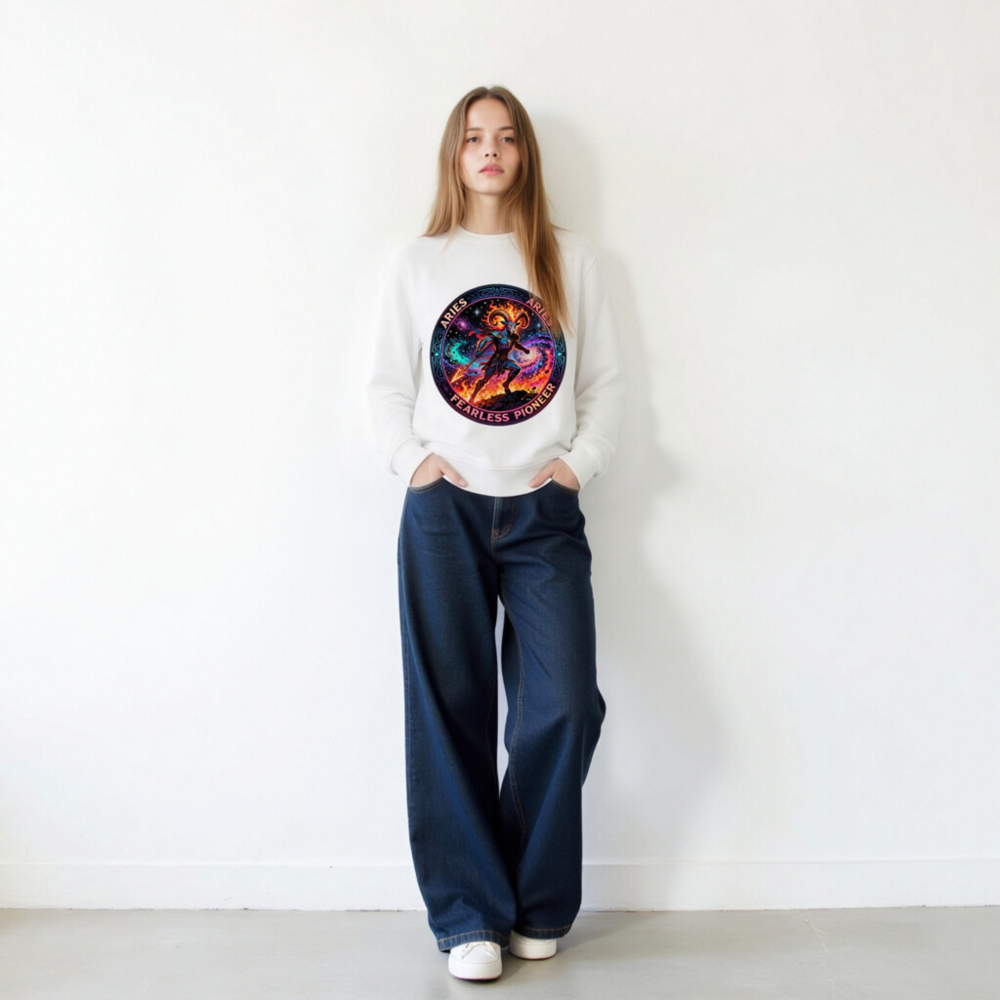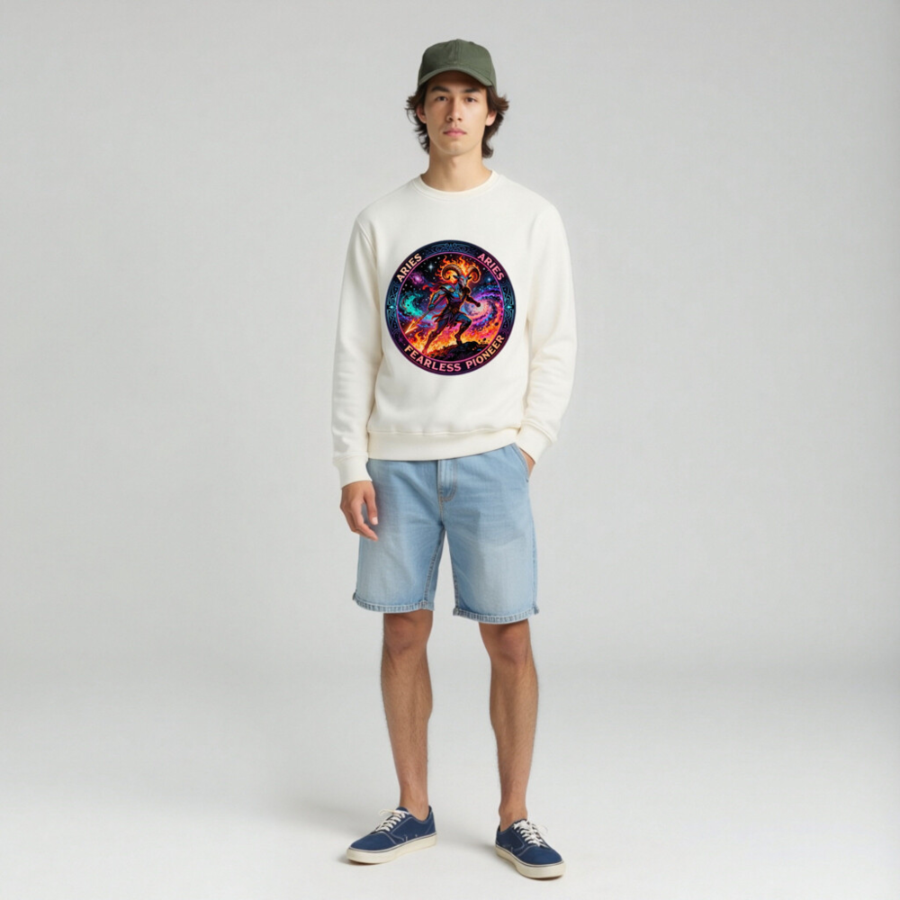 Aries Fearless Pioneer Unisex Organic Sweatshirt – Cosmic Ram Warrior Design