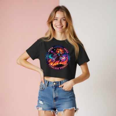 Bold Aries women’s crop top featuring a vibrant cosmic ram warrior holding a flaming spear, symbolizing courage and pioneering spirit. This premium-fit tee combines astrology art with modern streetwear style—perfect for zodiac lovers seeking empowerment in every outfit. Ideal for daily wear or astro-themed events.