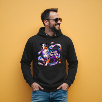 Showcase your love for Australian Shepherds with this premium unisex pullover hoodie featuring the vibrant ‘Aussie Herding Vortex!’ design. The eye-catching artwork highlights a colorful Aussie surrounded by cosmic vortexes and glowing orbs—perfect for dog lovers, herding enthusiasts, and fans of bold, artistic apparel. Made with high-quality materials for comfort and durability. Ideal for casual wear or as a unique gift.