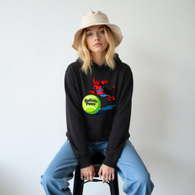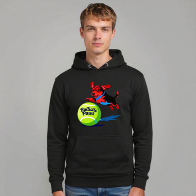 Show off your love for playful pups with this premium unisex pullover hoodie. Featuring a vibrant red-and-black dog leaping over a bright green tennis ball, the ‘Ballistic Paws’ graphic adds fun to any casual outfit. Made for comfort and everyday wear, this black hoodie pairs perfectly with jeans or joggers. Ideal for dog lovers, pet owners, or anyone who enjoys bold, whimsical designs. Soft fabric, front pocket, and classic hooded fit ensure all-day comfort.