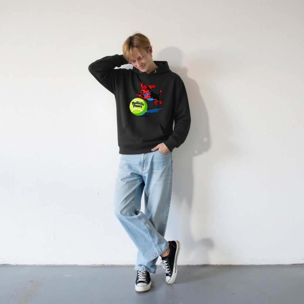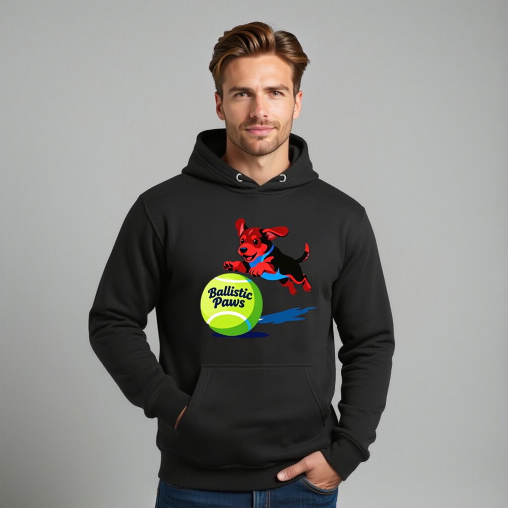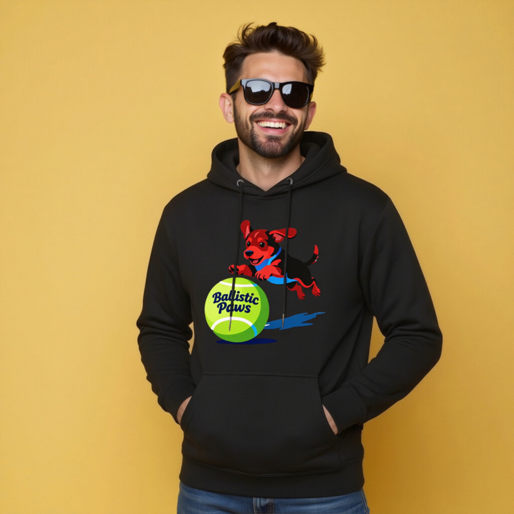 Ballistic Paws Unisex Premium Pullover Hoodie – Black Dog & Tennis Ball Design