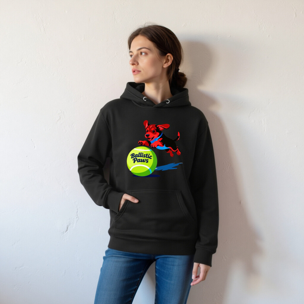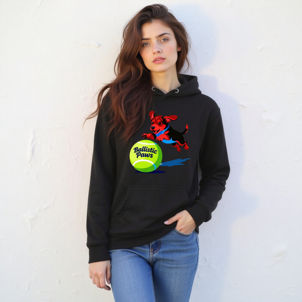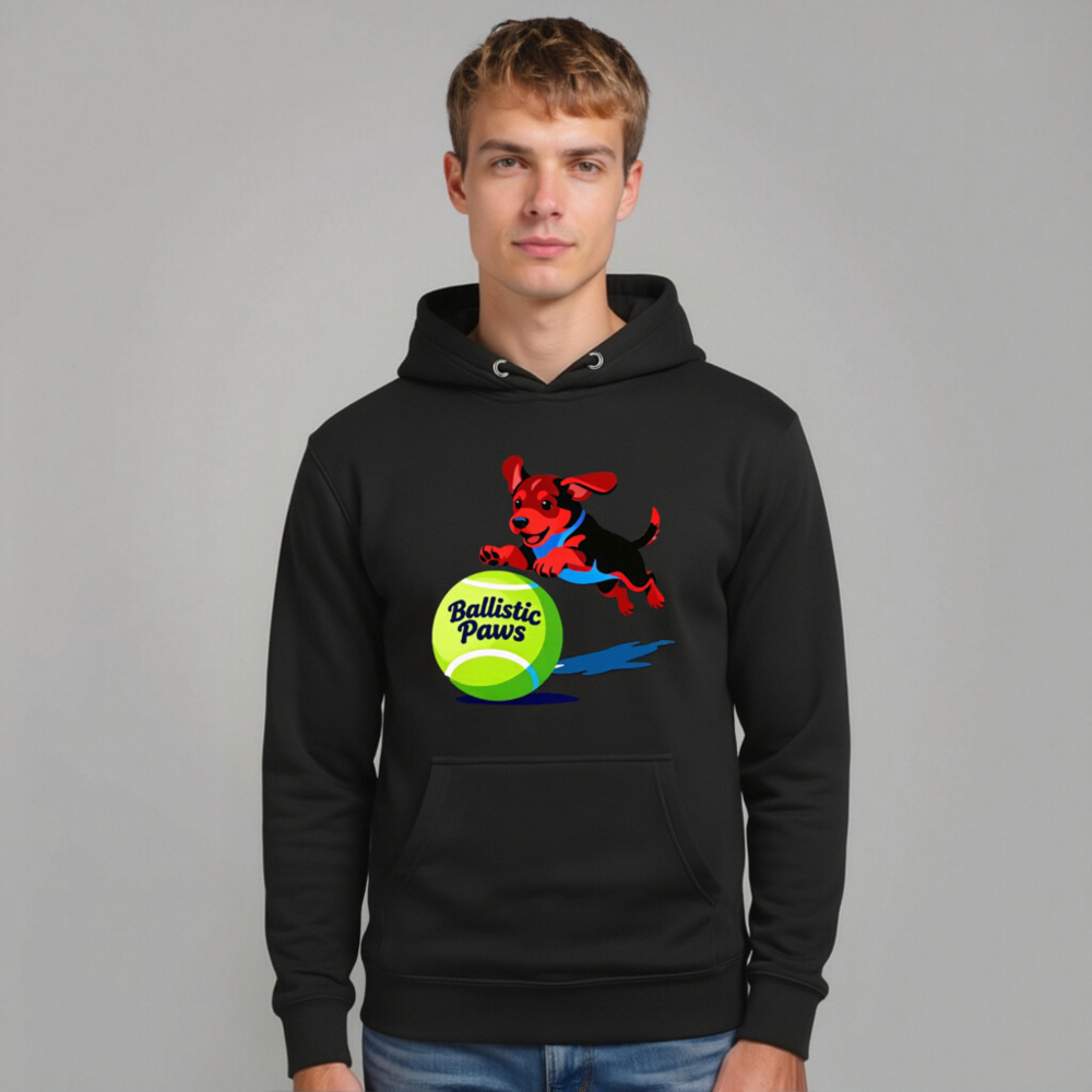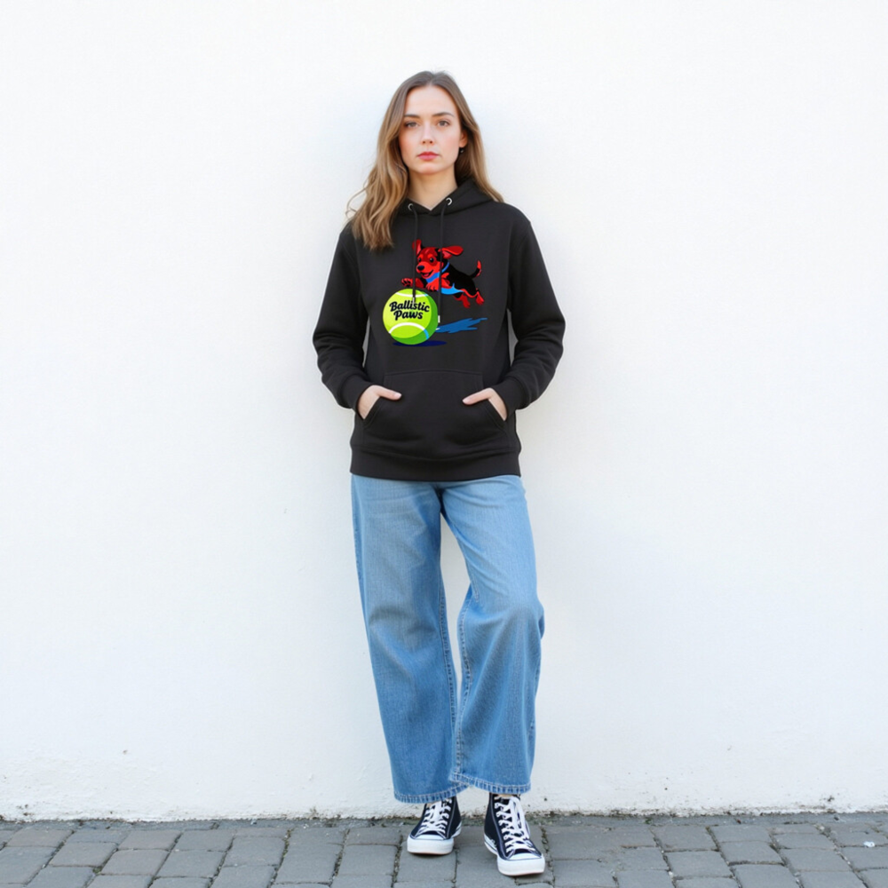 Ballistic Paws Unisex Premium Pullover Hoodie – Black Dog & Tennis Ball Design