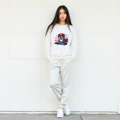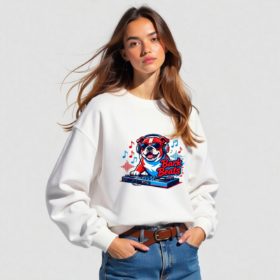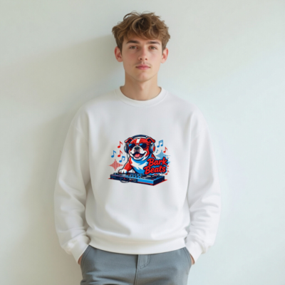 Show off your love for music and pets with this fun unisex crew neck sweatshirt featuring a cool bulldog DJ wearing headphones and sunglasses, spinning tracks on a turntable. The vibrant ‘Bark Beats’ design blends red, white, and blue tones with musical notes and waveforms—perfect for dog lovers and music fans. Soft, comfortable fit, ideal for casual wear or as a unique gift.