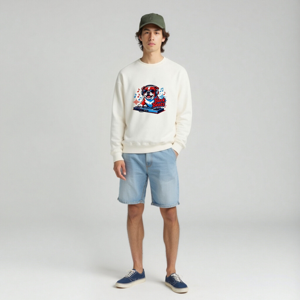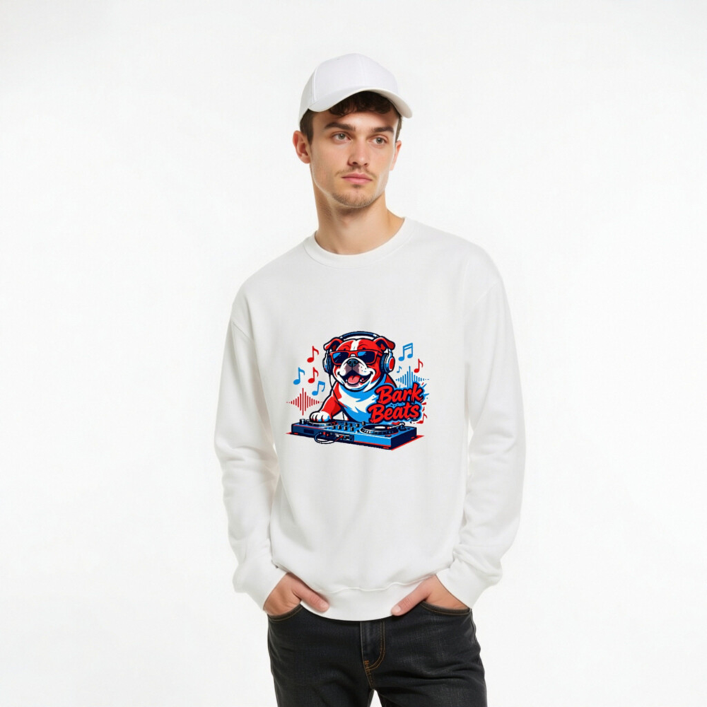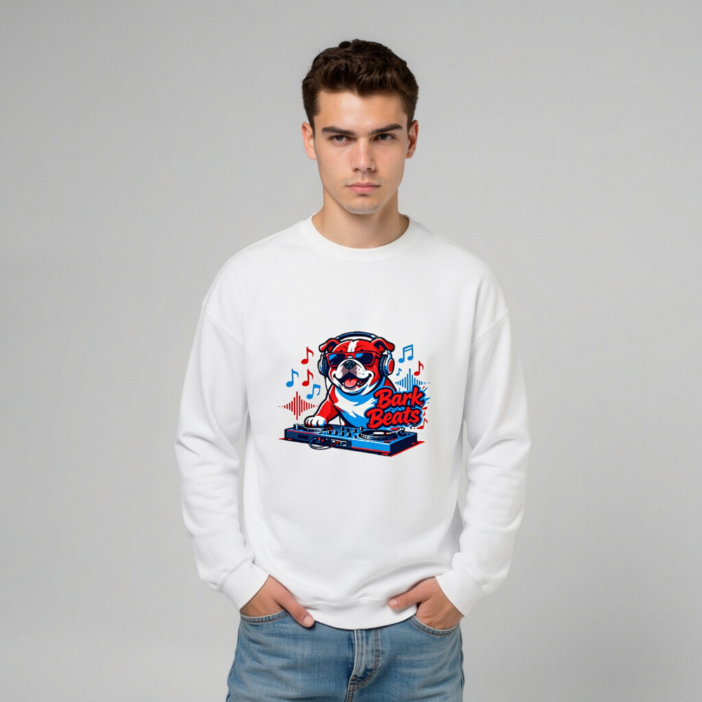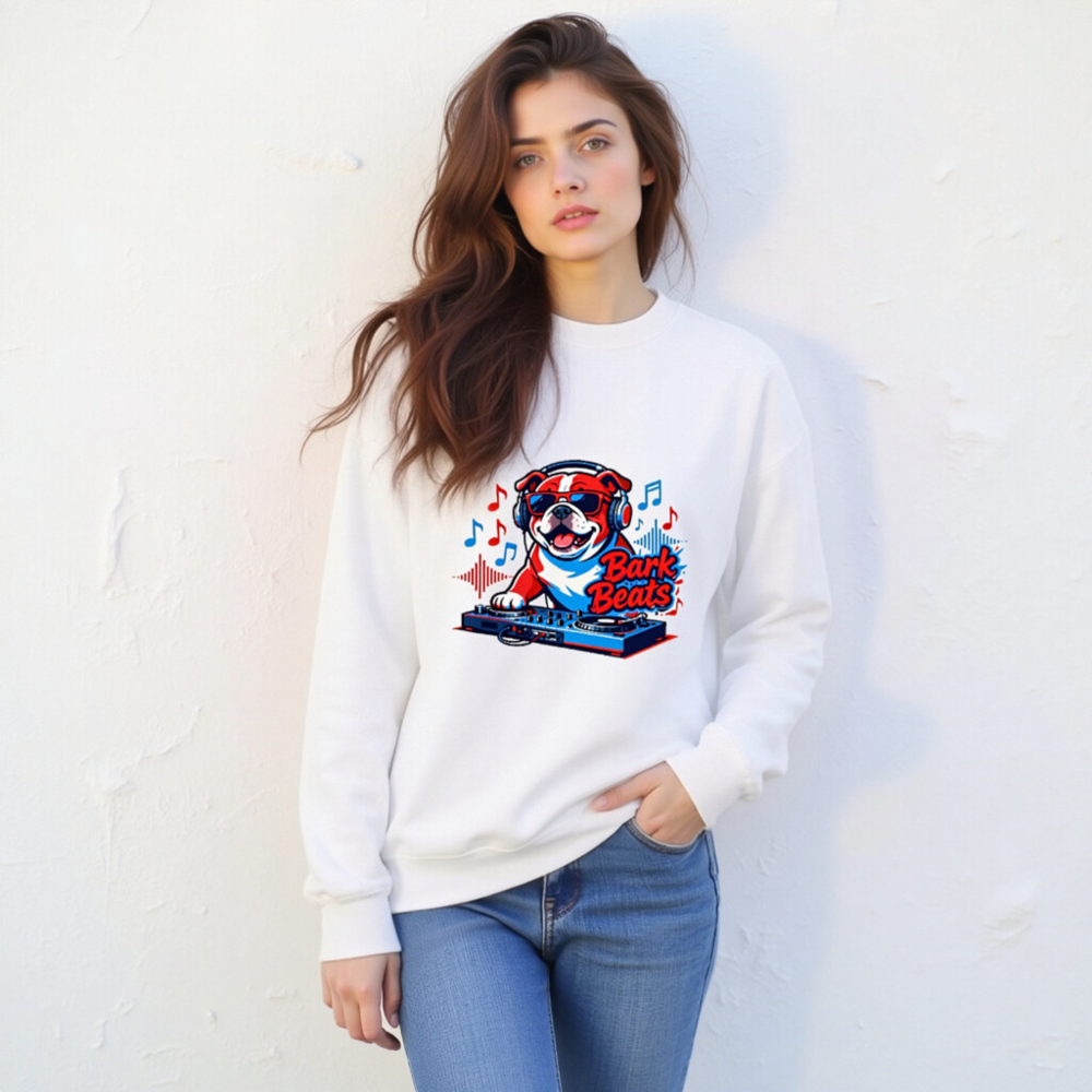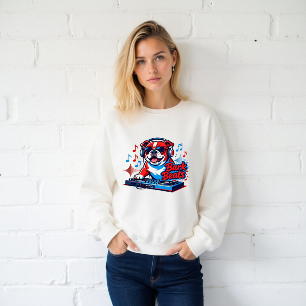Show off your love for music and pets with this fun unisex crew neck sweatshirt featuring a cool bulldog DJ wearing headphones and sunglasses, spinning tracks on a turntable. The vibrant ‘Bark Beats’ design blends red, white, and blue tones with musical notes and waveforms—perfect for dog lovers and music fans. Soft, comfortable fit, ideal for casual wear or as a unique gift.