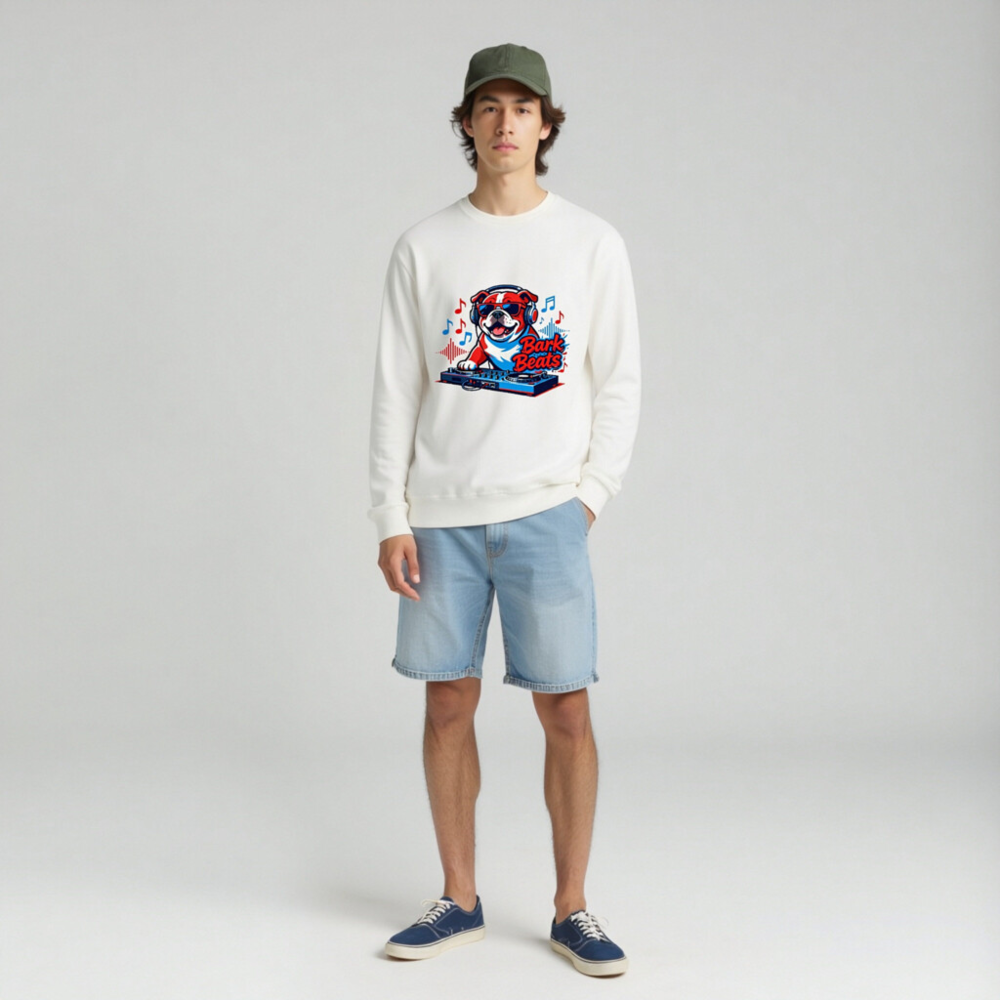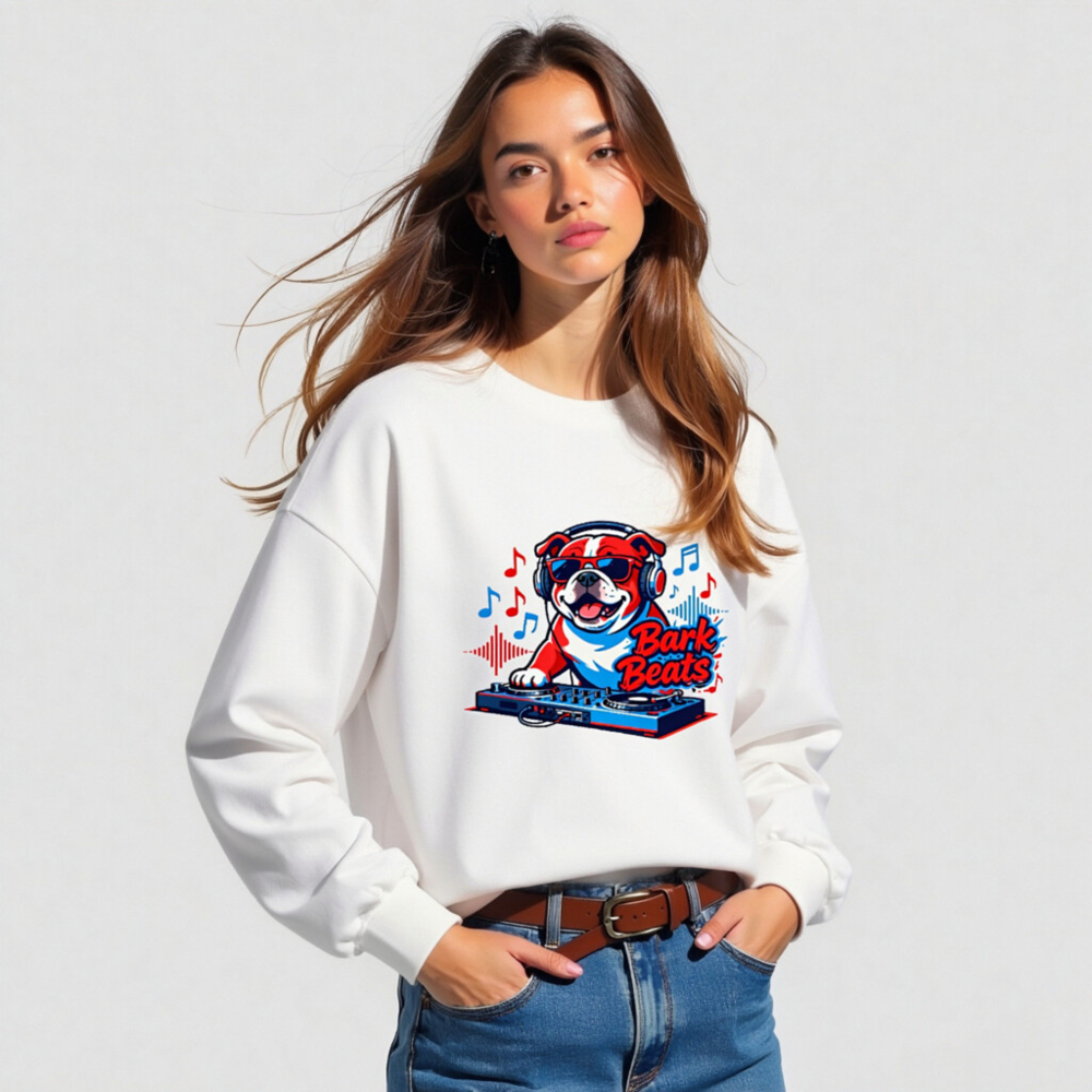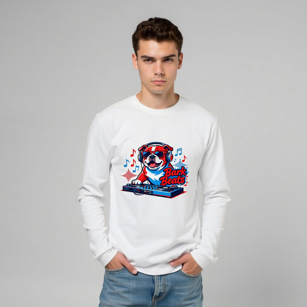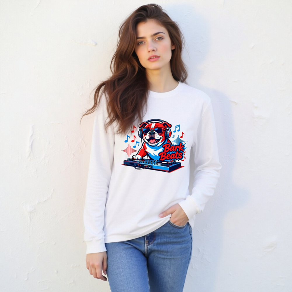 Show off your love for music and pets with this vibrant unisex long sleeve tee featuring a red, white & blue bulldog DJing on a turntable. The ‘Bark Beats’ design includes headphones, sunglasses, and musical notes—perfect for dog lovers who groove to the beat. Soft cotton blend, comfortable fit, ideal for casual wear or music events.