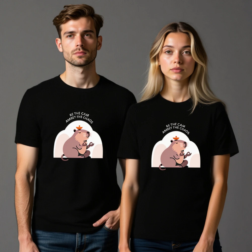 Stay centered with this unisex staple t-shirt featuring a serene capybara in meditation, balancing a tiny orange bowl atop its head. The uplifting phrase ‘BE THE CALM AMIDST THE CHAOS’ wraps the design in mindful positivity. Soft, comfortable fit for everyday wear—ideal for those seeking calm in busy lives. Perfect gift for mindfulness lovers and animal enthusiasts.