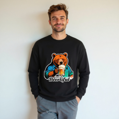 A fun, unisex crew neck sweatshirt featuring a cozy bear in a blue shirt holding a frothy beer mug. The playful ‘Life is Beertiful’ slogan adds humor and charm—perfect for beer enthusiasts and casual wear. Soft, comfortable fit with bold graphic design. Ideal gift for birthdays, holidays, or just because.