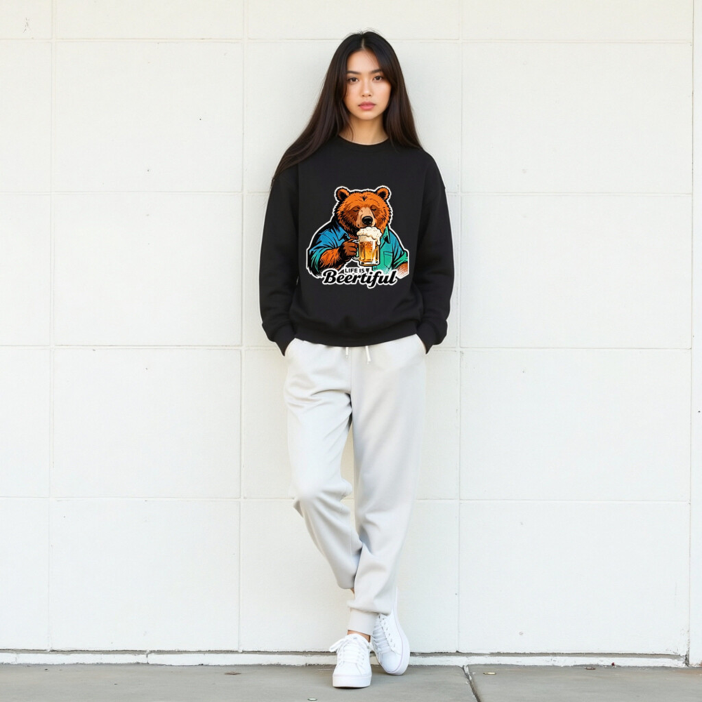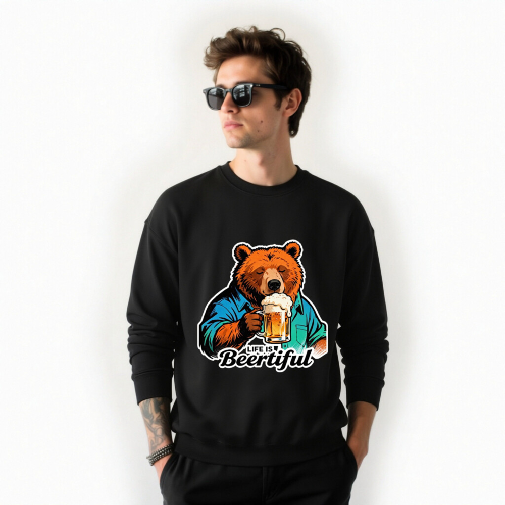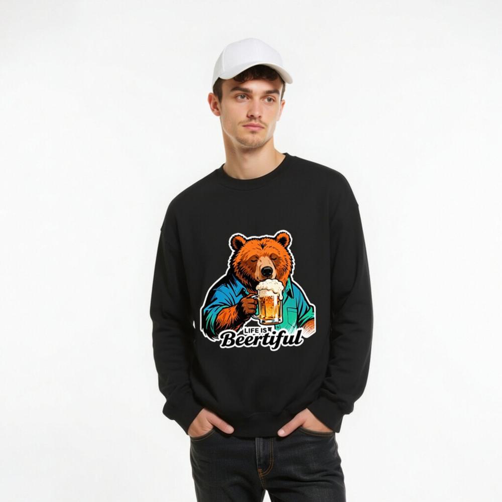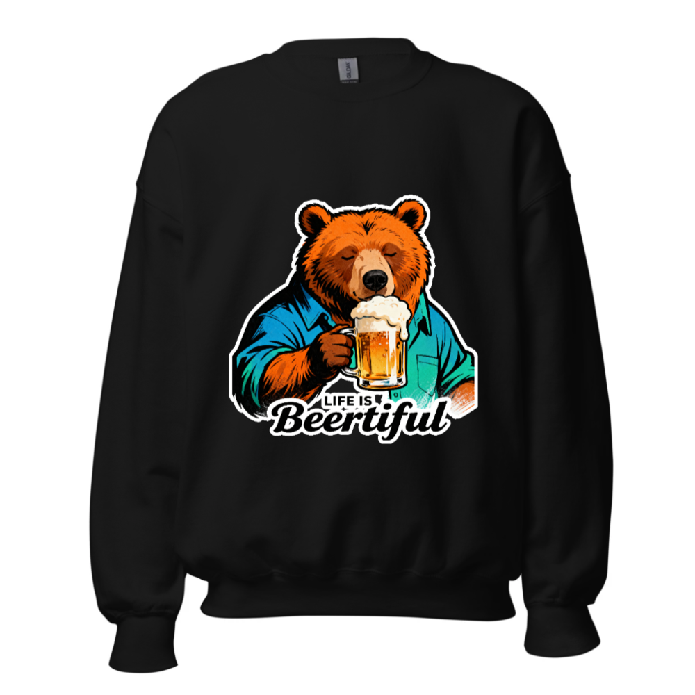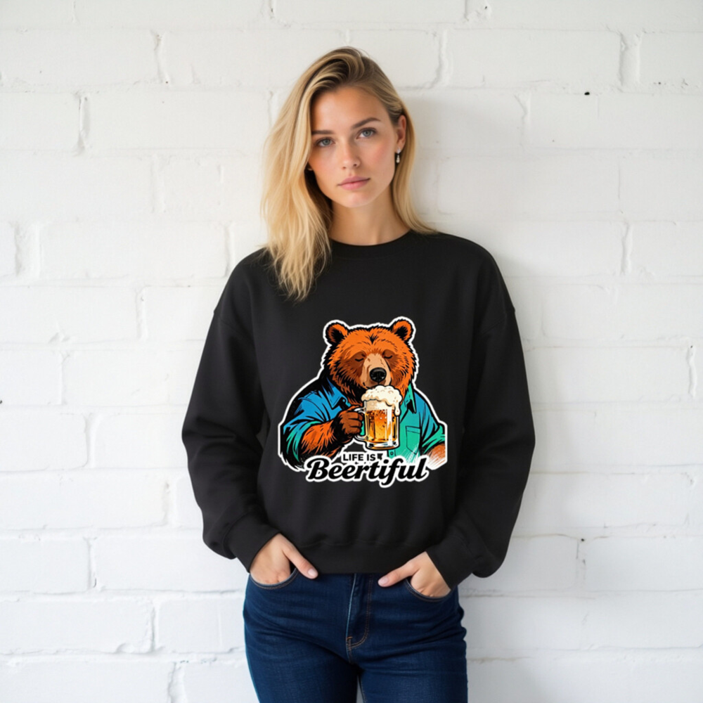 A fun, unisex crew neck sweatshirt featuring a cozy bear in a blue shirt holding a frothy beer mug. The playful ‘Life is Beertiful’ slogan adds humor and charm—perfect for beer enthusiasts and casual wear. Soft, comfortable fit with bold graphic design. Ideal gift for birthdays, holidays, or just because.