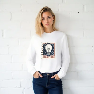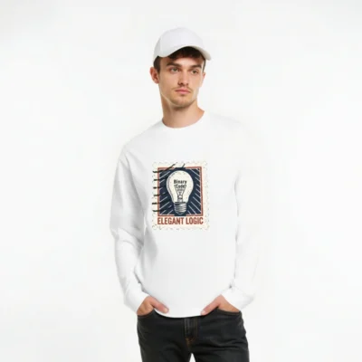 Elegant Logic unisex long sleeve tee features a vintage stamp-style graphic with a lightbulb labeled ‘Binary Code 0101’—symbolizing smart thinking and tech-inspired style. Soft, comfortable cotton blend for everyday wear. Perfect for coders, engineers, and logic lovers. Designed for universal fit—sized for men, women, and non-binary. Classic white base with bold retro print.