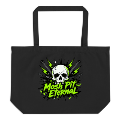 This large black organic tote bag features a bold ‘Mosh Pit Eternal’ skull design with neon green lightning, guitars, and chains—perfect for punk, metal, and rock fans. Made from certified organic cotton (verified by GOTS standard), it’s eco-friendly, durable, and supports sustainable fashion. Ideal as a statement accessory or gift for music lovers. Lightweight, reusable, and machine-washable.