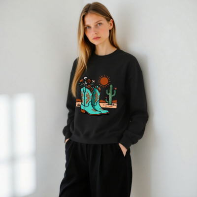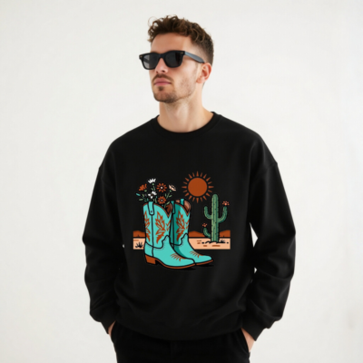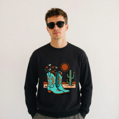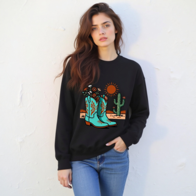 This unisex crew neck sweatshirt features a vibrant desert-themed design: turquoise cowboy boots with orange floral embroidery, blooming wildflowers, a green saguaro cactus, and a warm sun over sandy dunes. Perfect for western lovers—soft, comfortable, and stylish. Ideal for casual wear or as a unique gift.