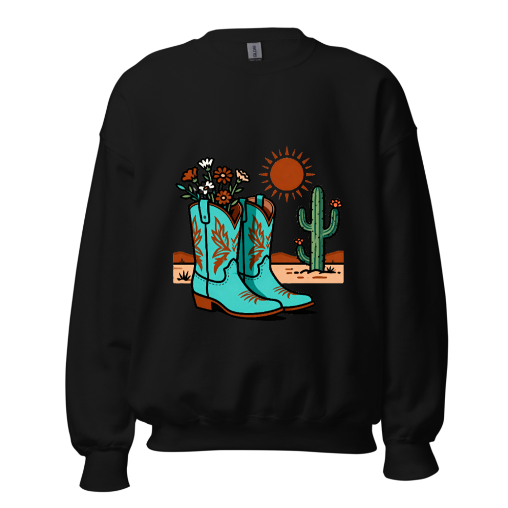 This unisex crew neck sweatshirt features a vibrant desert-themed design: turquoise cowboy boots with orange floral embroidery, blooming wildflowers, a green saguaro cactus, and a warm sun over sandy dunes. Perfect for western lovers—soft, comfortable, and stylish. Ideal for casual wear or as a unique gift.
