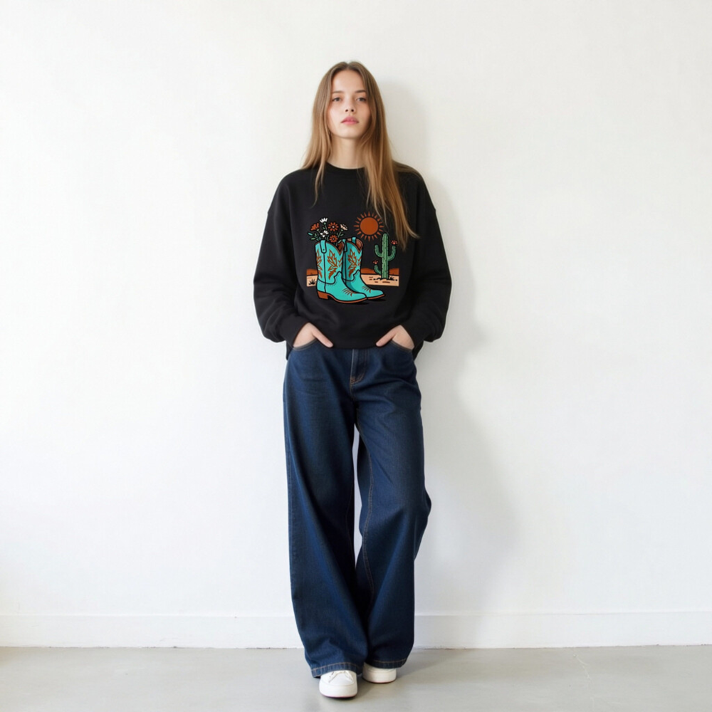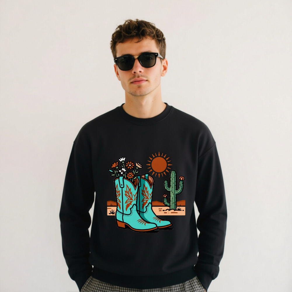 Blue Cowboy Boots & Cactus Desert Sweatshirt | Unisex Crew Neck