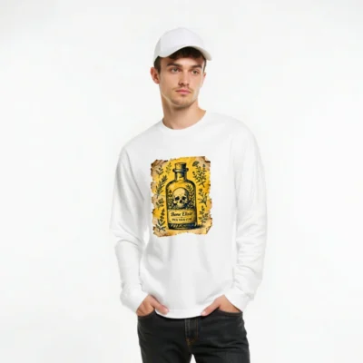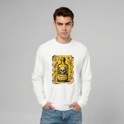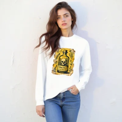 This unisex long sleeve tee features a vintage-style ‘Bone Elixir’ potion bottle design with skull, herbs, and aged parchment background. The graphic includes the phrase ‘Pick Your Cure’—perfect for gothic, occult, or herbalist enthusiasts. Made from soft, comfortable fabric with a classic fit. Ideal for Halloween, LARP, or everyday alternative fashion. Timeless aesthetic, high-quality print that resists fading.