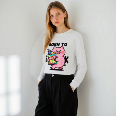 Adorable pink pig holding a snack bag and Pepsi cup, printed on premium unisex long sleeve tee. Soft cotton blend for all-day comfort. Perfect for snack lovers and cartoon fans. Fun, casual design fits men and women. Machine washable, true to size. Ideal gift for birthdays or holidays.