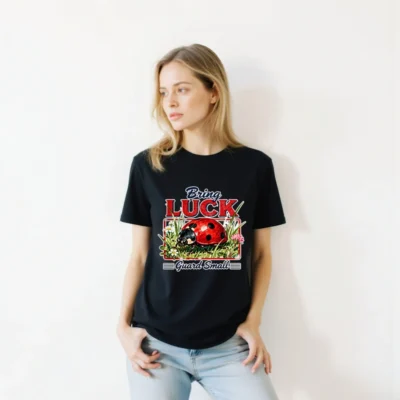This unisex organic cotton t-shirt features a charming vintage-style graphic of a red ladybug in grass with daisies and clover, paired with the playful phrase ‘Bring Luck Guard Small’. Soft, eco-friendly, and screen-printed for lasting vibrancy. Perfect for nature lovers, gardeners, or anyone who appreciates whimsical, lucky charm designs. Fair trade certified, pre-shrunk, and available in classic black for everyday comfort and style. A fun, meaningful gift that spreads positivity.