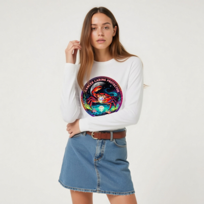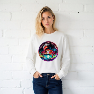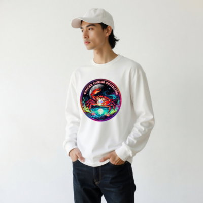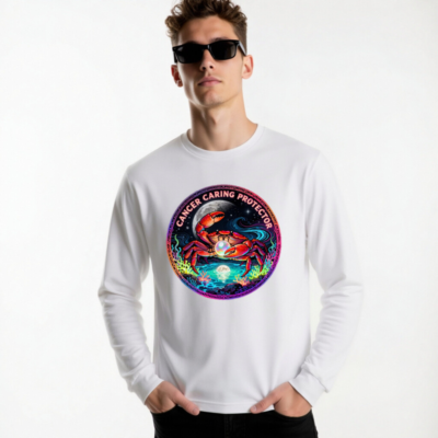 Wear the ‘Cancer Caring Protector’ unisex long sleeve tee—a vibrant, cosmic-themed design featuring a radiant crab holding a pearl under moonlight, surrounded by colorful sea life and starry waves. Perfect for astrology lovers, Cancer zodiac enthusiasts, or anyone seeking symbolic protection and compassion. Soft, comfortable fit—ideal for daily wear or as meaningful gift.