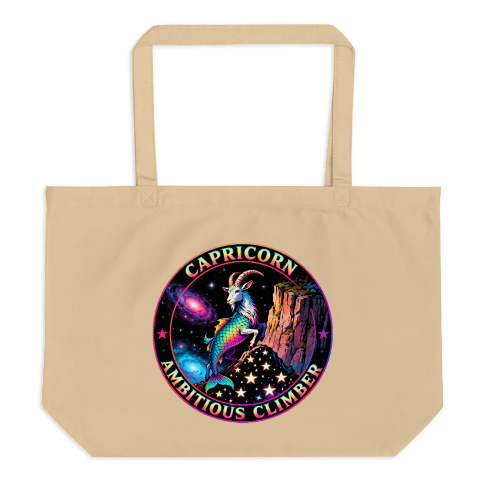 Celebrate your Capricorn spirit with this vibrant, large organic tote bag featuring a rainbow-hued goat-climber against a cosmic cliff backdrop. Made from certified organic cotton, it’s eco-conscious and durable—perfect for everyday use. The bold ‘Capricorn Ambitious Climber’ design blends astrology, art, and sustainability. Ideal as a thoughtful gift or personal statement piece. Lightweight, spacious, and responsibly crafted.