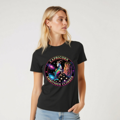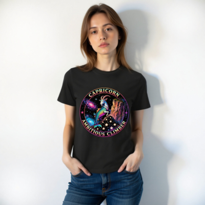 Celebrate your Capricorn spirit with this vibrant, unisex organic cotton t-shirt featuring a cosmic goat-climber design—symbolizing ambition and resilience. The vivid rainbow-hued Capricorn stands atop a cliff against a starry galaxy backdrop, encircled by the words ‘CAPRICORN’ and ‘AMBITIOUS CLIMBER’. Soft, eco-friendly, and proudly made from certified organic cotton for comfort and sustainability.