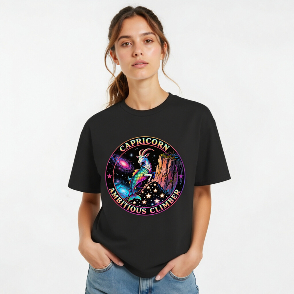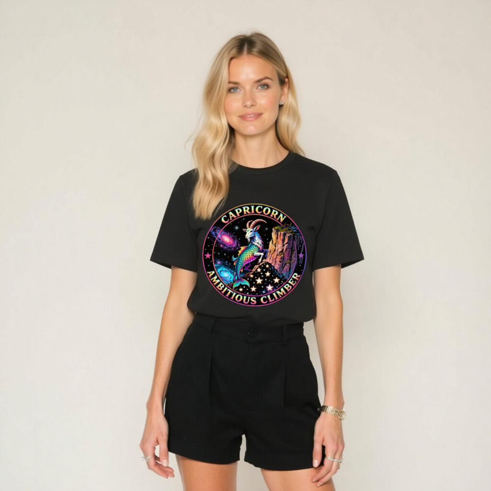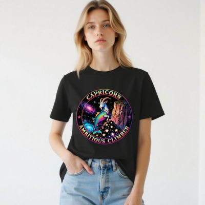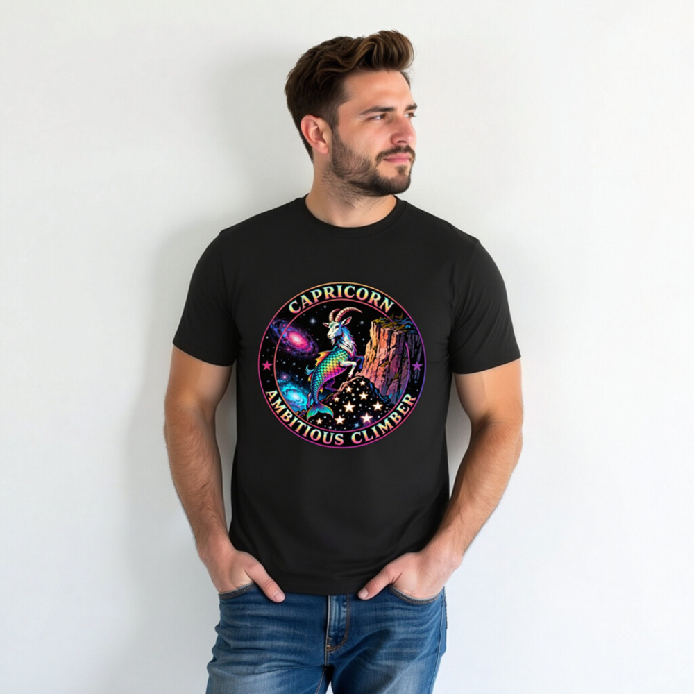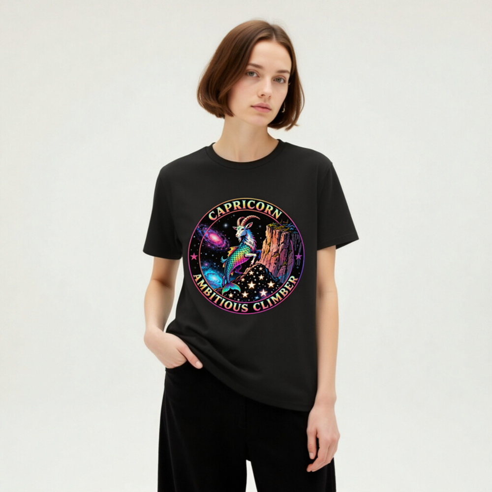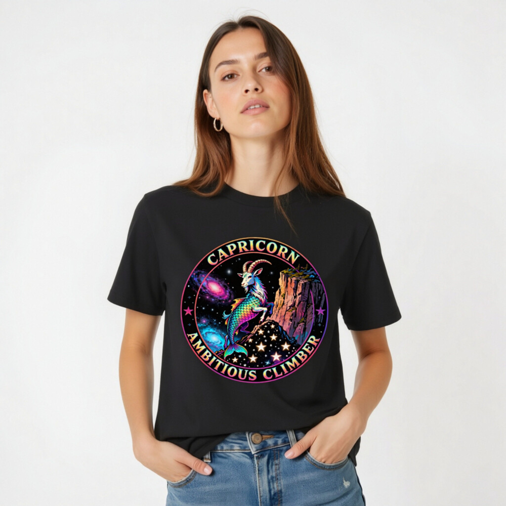 Celebrate your Capricorn spirit with this vibrant, unisex organic cotton t-shirt featuring a cosmic goat-climber design—symbolizing ambition and resilience. The vivid rainbow-hued Capricorn stands atop a cliff against a starry galaxy backdrop, encircled by the words ‘CAPRICORN’ and ‘AMBITIOUS CLIMBER’. Soft, eco-friendly, and proudly made from certified organic cotton for comfort and sustainability.