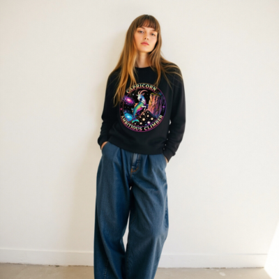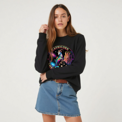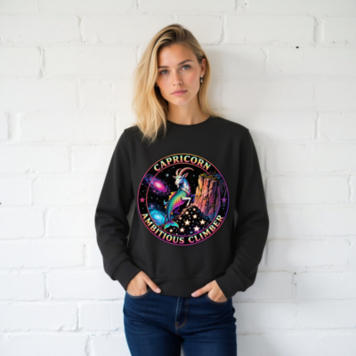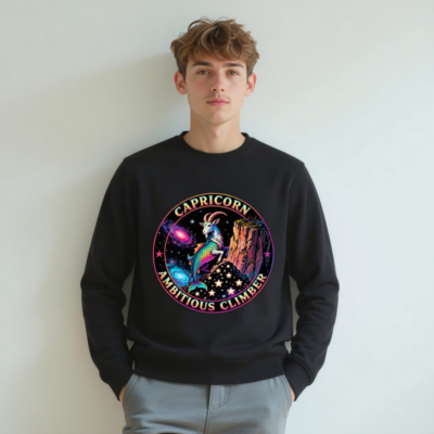 Vibrant Capricorn zodiac design: rainbow goat-climber on cosmic cliff, surrounded by stars and nebulae. Unisex organic sweatshirt—soft, sustainable, and bold. Perfect for astrology lovers seeking empowering, eye-catching apparel. Eco-friendly fabric, ethical production.