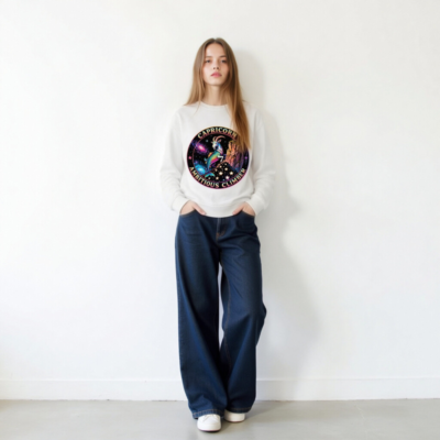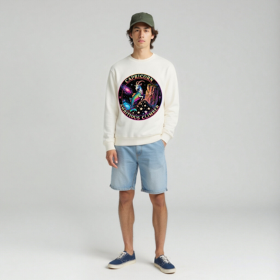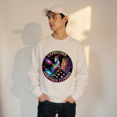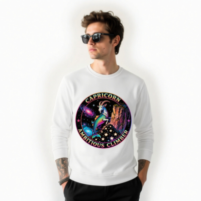 Wear the spirit of Capricorn: a vibrant, rainbow-hued goat-climber perched on a cosmic cliff against swirling galaxies and stars. This unisex organic sweatshirt features bold ‘CAPRICORN’ and ‘AMBITIOUS CLIMBER’ text in a retro circular badge. Crafted for comfort and sustainability—made with certified organic cotton. Ideal for astrology lovers, dreamers, and ambitious climbers seeking meaningful style.