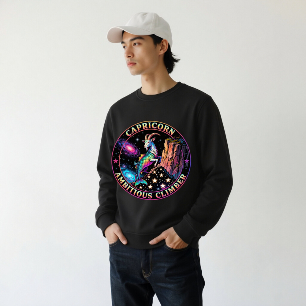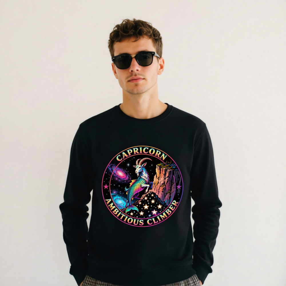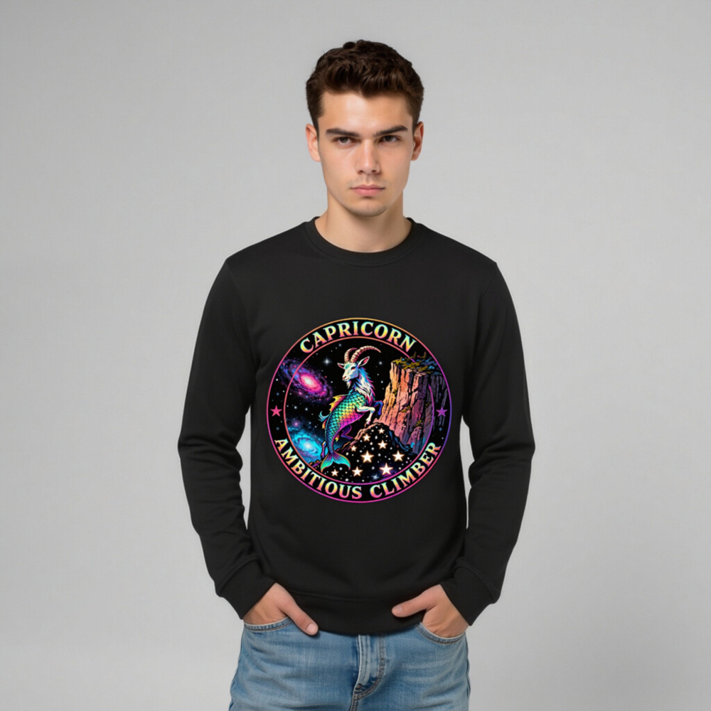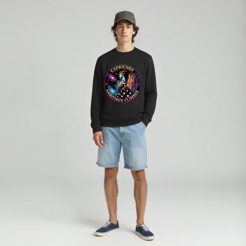 Vibrant Capricorn zodiac design: rainbow goat-climber on cosmic cliff, surrounded by stars and nebulae. Unisex organic sweatshirt—soft, sustainable, and bold. Perfect for astrology lovers seeking empowering, eye-catching apparel. Eco-friendly fabric, ethical production.